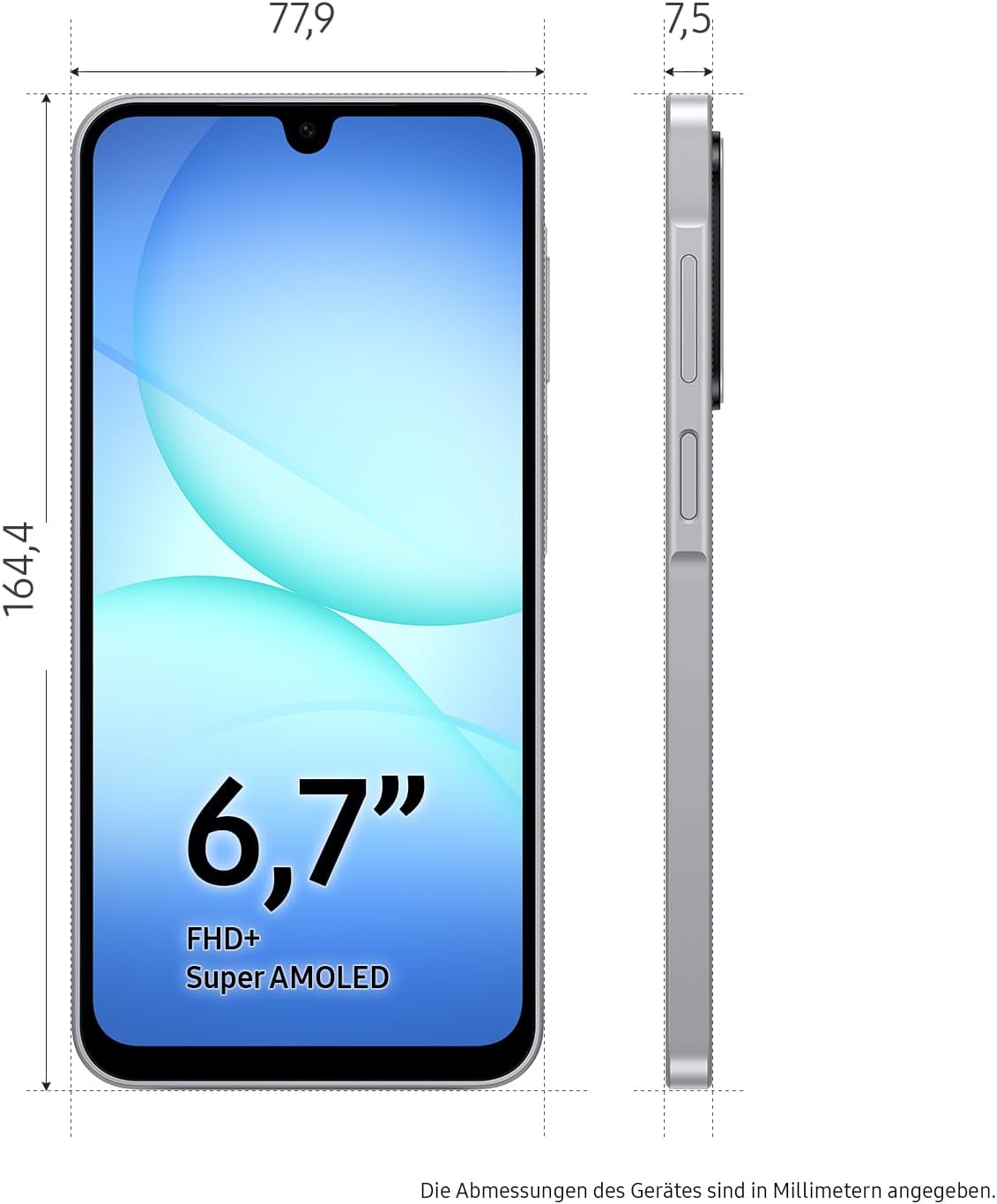 • Шик, тънък, зашеметяващ: смартфонът Samsung Galaxy A17 5G има тънка рамка от 7,5 мм с ревизиран Key Island 2.0; тясното разположение на камерите в една линия предлага изобилие от стил - за малък обем и елегантен дизайн.