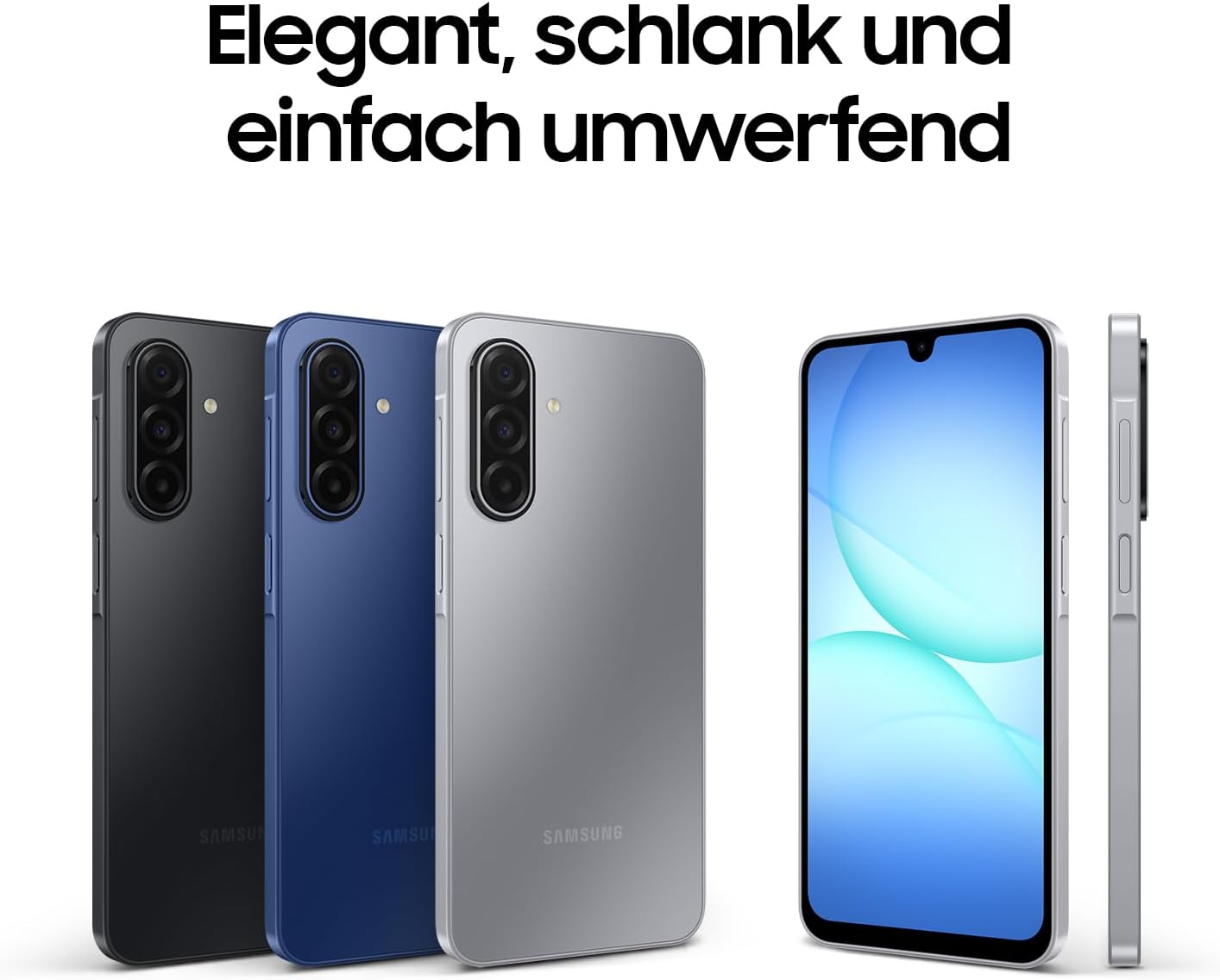 • Шик, тънък, зашеметяващ: смартфонът Samsung Galaxy A17 5G има тънка рамка от 7,5 мм с ревизиран Key Island 2.0; тясното разположение на камерите в една линия предлага изобилие от стил - за малък обем и елегантен дизайн.