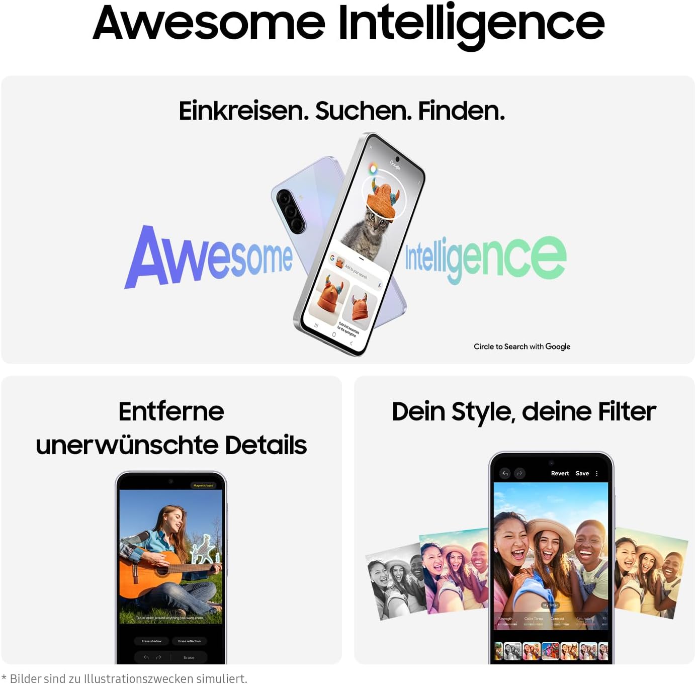 • Функции на изкуствен интелект: очертаване на текст или обекти в кръг, за да получите резултати от търсенето, създаване на впечатляващи фото ефекти с помощта на филтри и използване на детектора на обекти за откриване и премахване на хора на заден план²³