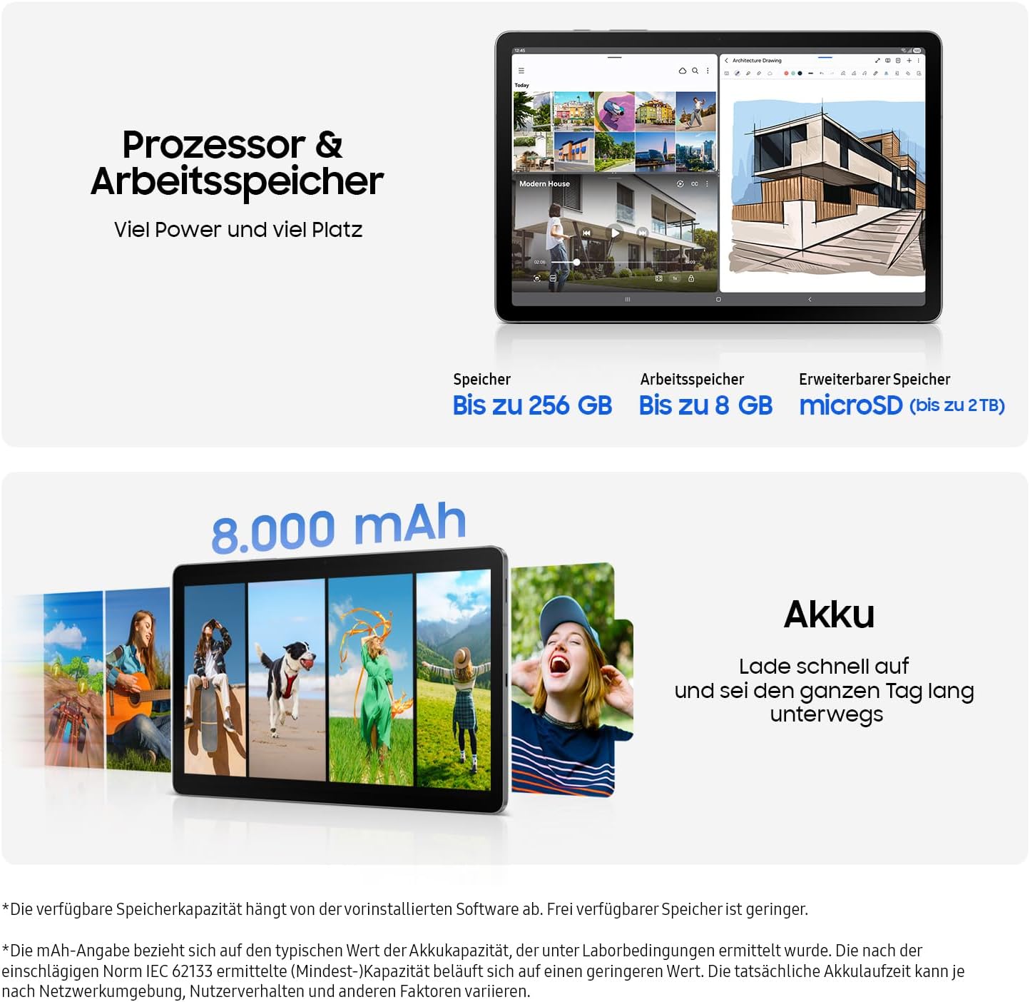 • Батерия и аксесоари: С батерия от 8000 mAh и бързо зареждане сте готови за натоварени графици; Galaxy Tab S10 Lite може лесно да се използва с различни аксесоари за таблет; Персонализирайте настройката си според вашите нужди¹⁸ ¹⁹ ²⁰ ²¹ ²²