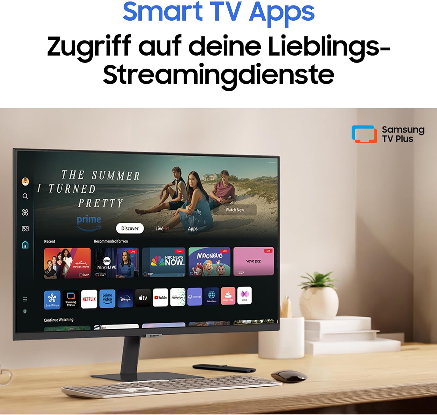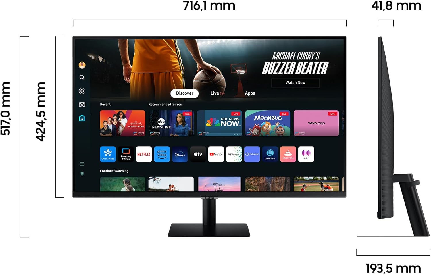 Samsung M70D Smart Monitor, 32 инча, 4K AI Upscaling, UHD, 60 Hz, стрийминг монитор с център за забавление и игри, екран с високоговорители, Smart TV приложения с дистанционно управление, LS32DM700UUXEN