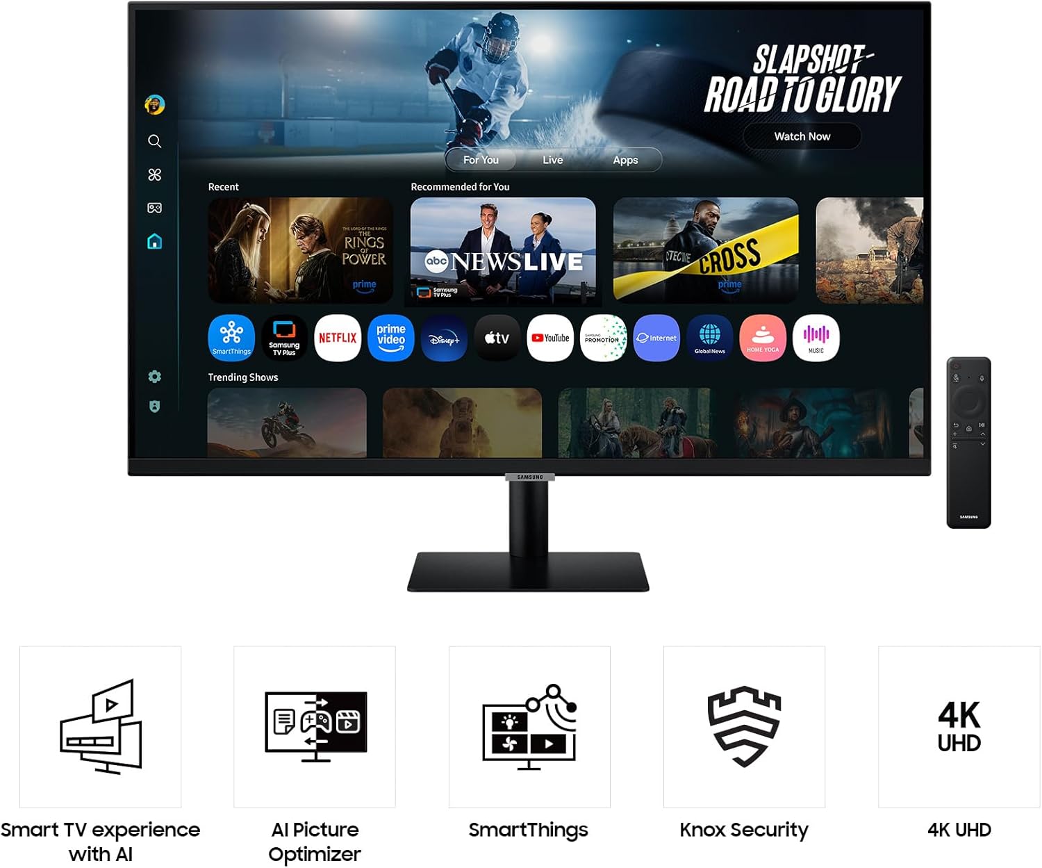 Samsung M70F 32-инчов 4K Smart AI монитор, VA панел, 3840 x 2160, 60Hz, 4ms (G/G), високоговорител, геймърски хъб, 4K мащабиране, гласово управление, Smart TV приложения и AI функции, HDR10, LS32FM700UUXEN