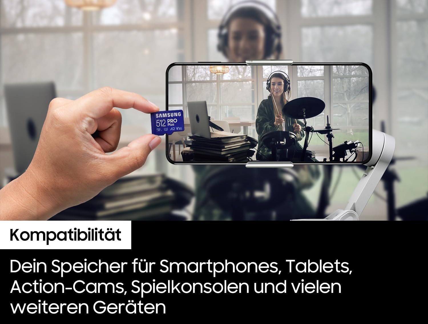 Samsung Pro Plus microSD карта + USB четец за карти, 512 GB, за мобилни игри на смартфони, таблети и преносими конзоли, UHS-I U3, Full HD и 4K UHD, 180 MB/s четене, 130 MB/s запис, MB-MD512SB/WW