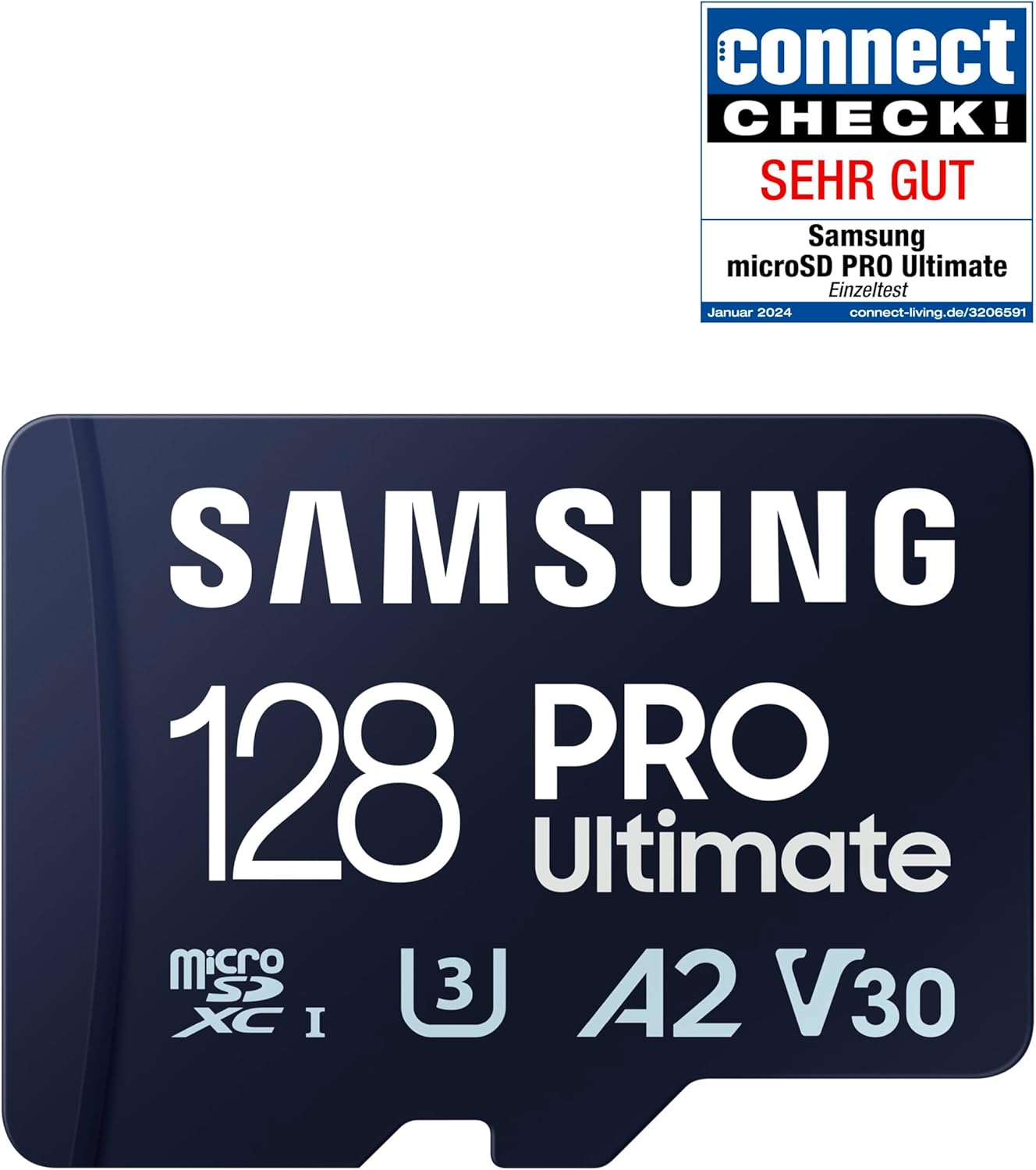 Samsung Pro Ultimate microSD карта + SD адаптер, 128 GB, за смартфони, дронове и екшън камери, UHS-I U3, 200 MB/s четене, 130 MB/s запис, ‎ MB-MY128SA/WW