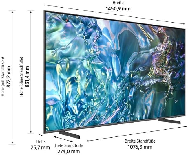 • Обхват на доставката: 1 x Samsung TV GQ65Q64DAUXZG QLED 4K Q64D, 65 инча, Smart TV, вкл. дистанционно управление Premium Solar Smart Remote, немски модел [2024]