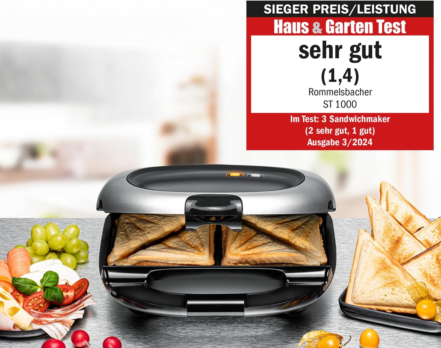 Сандвич машина ROMMELSBACHER ST 1000 - Изключително дълбоки кухини за печене, за 2 американски XL сандвича, незалепващо покритие, защита от преливане, уплътнение по целия периметър, високи разделители, пестене на място при съхранение