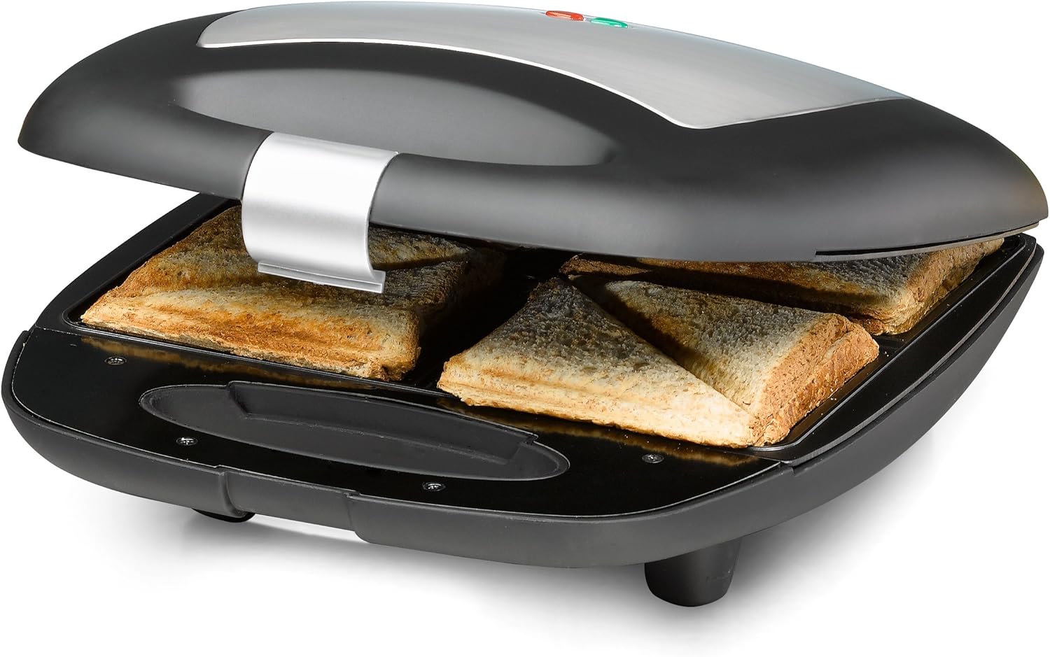 • За 2 сандвича, корпус от матирана пластмаса и полирана неръждаема стомана, плочи за препичане от масивен лят алуминий