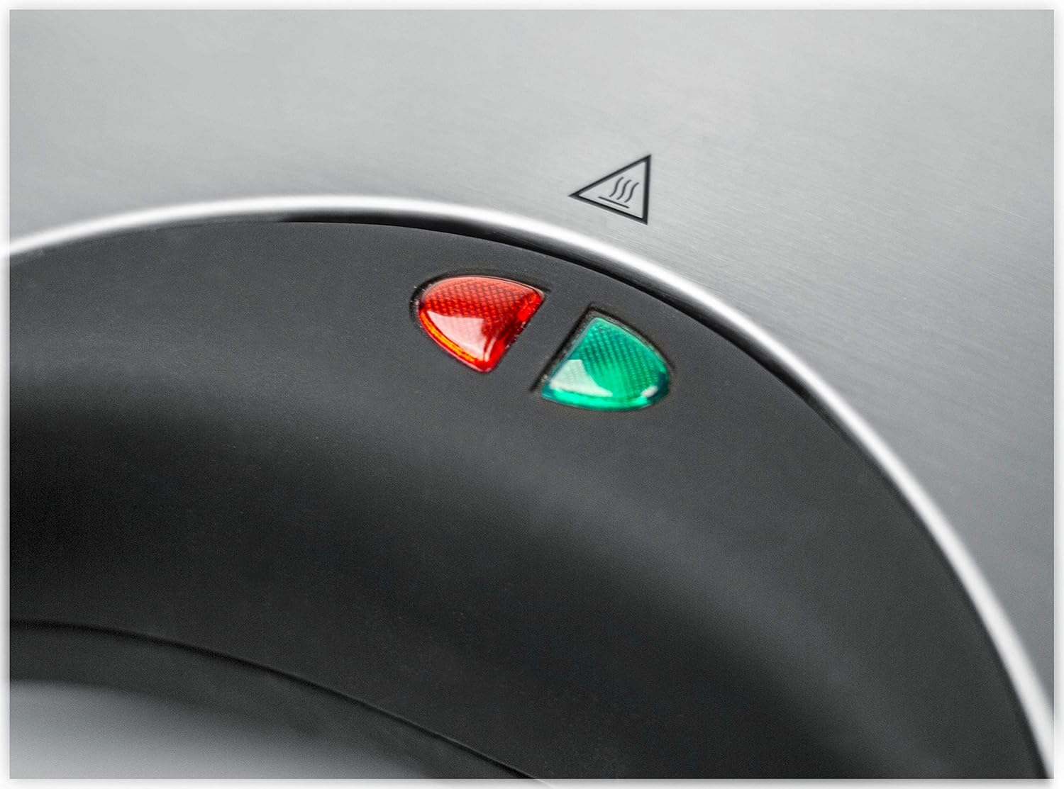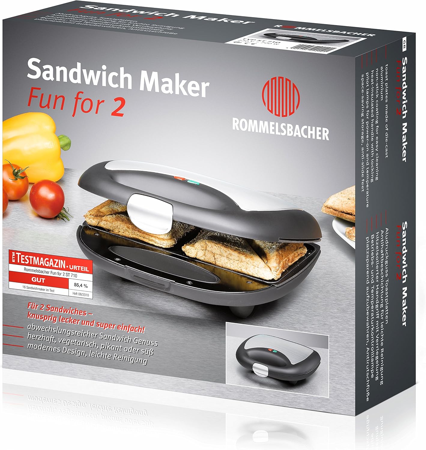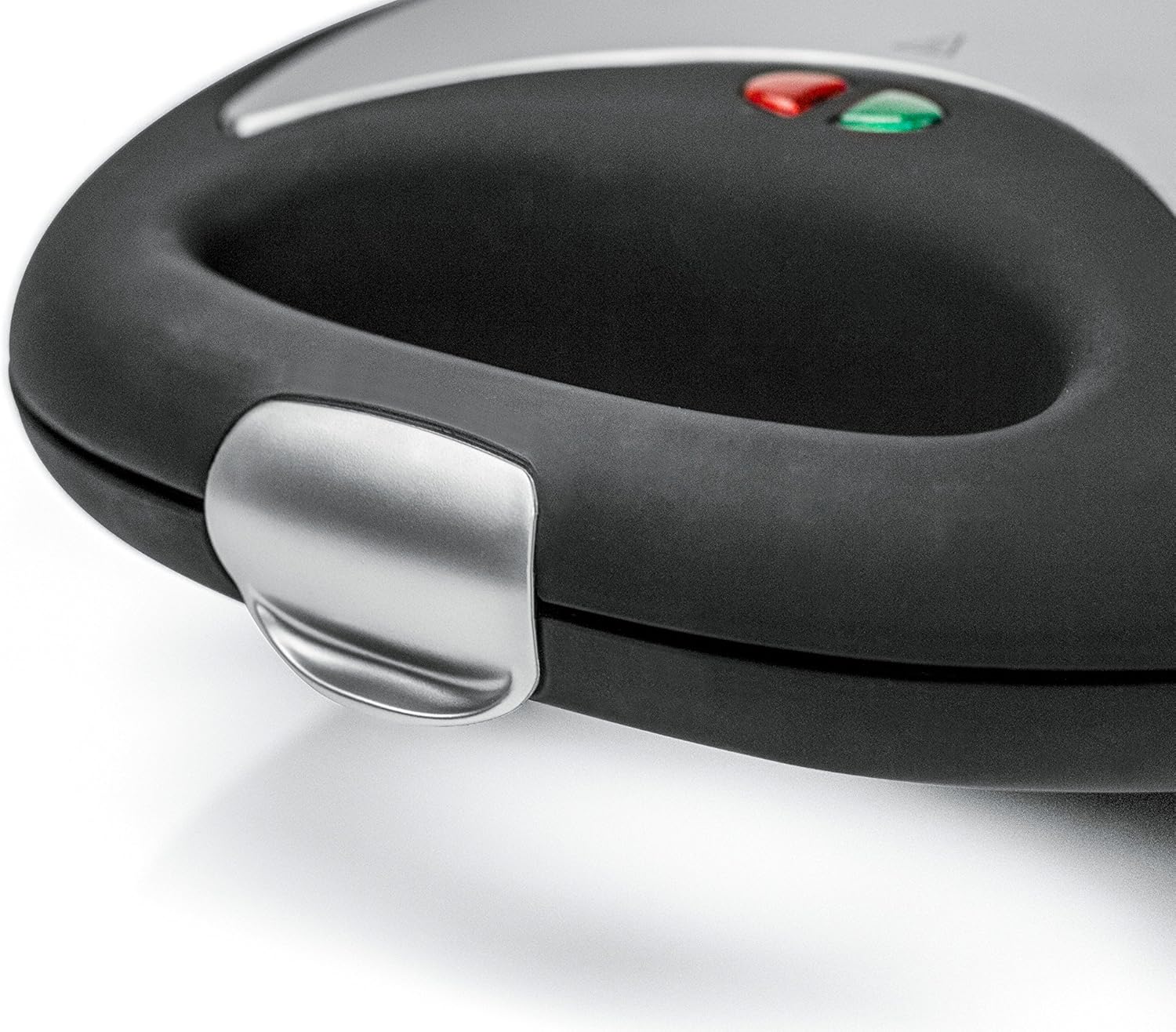 • За 2 сандвича, корпус от матирана пластмаса и полирана неръждаема стомана, плочи за препичане от масивен лят алуминий
