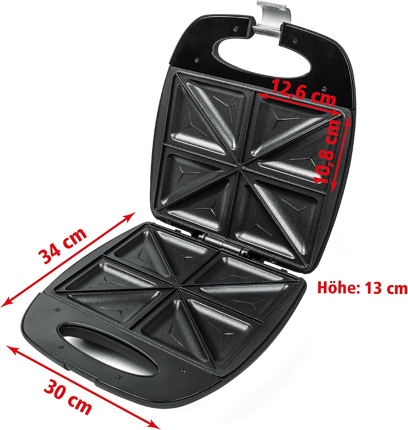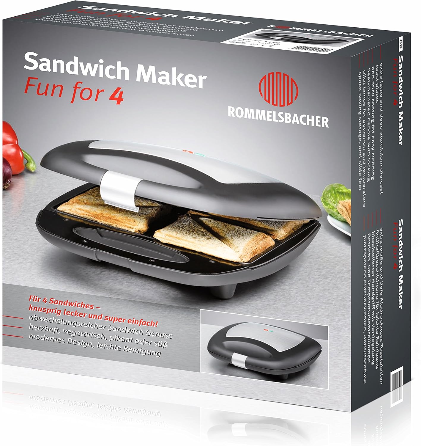 • За 2 сандвича, корпус от матирана пластмаса и полирана неръждаема стомана, плочи за препичане от масивен лят алуминий