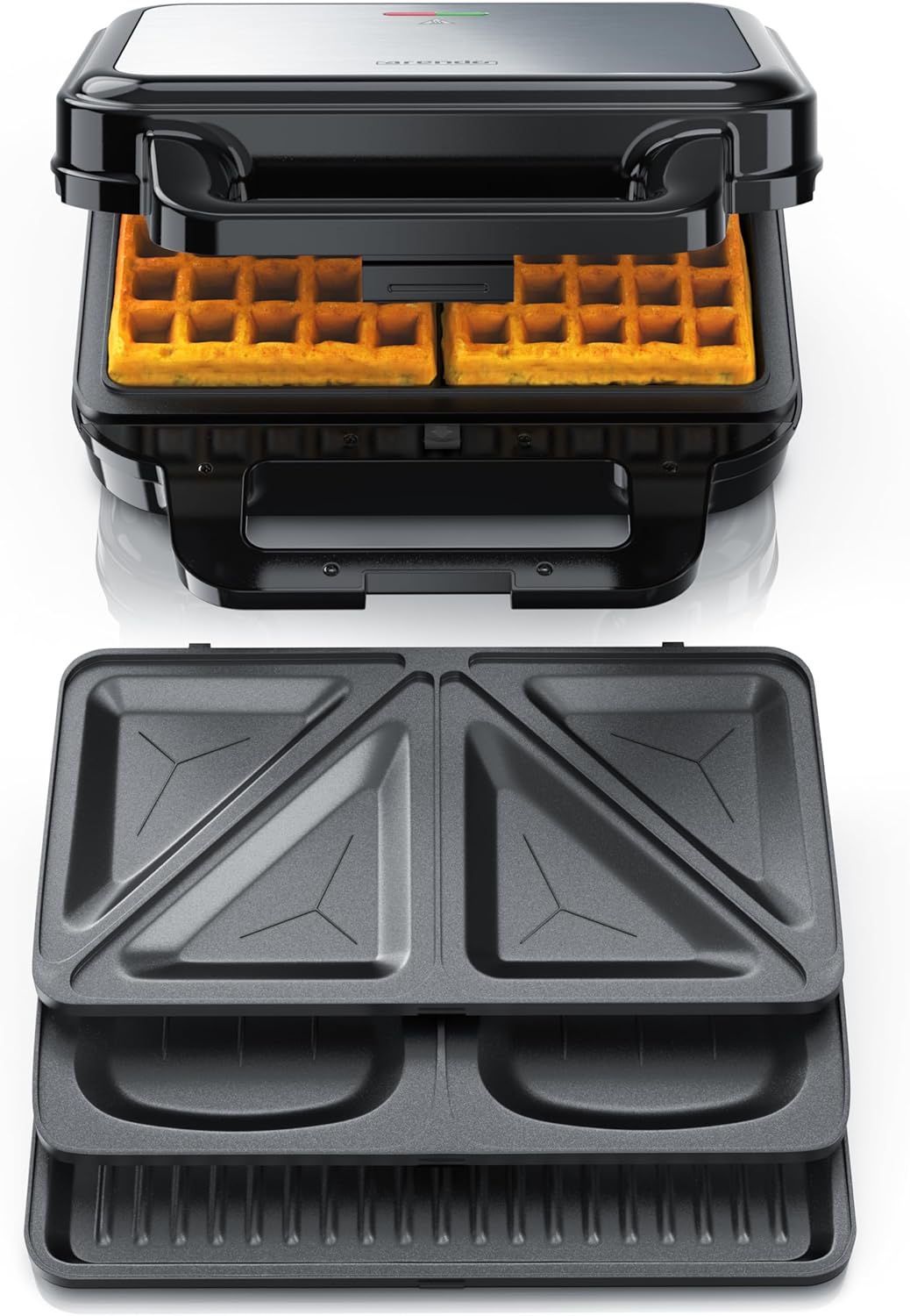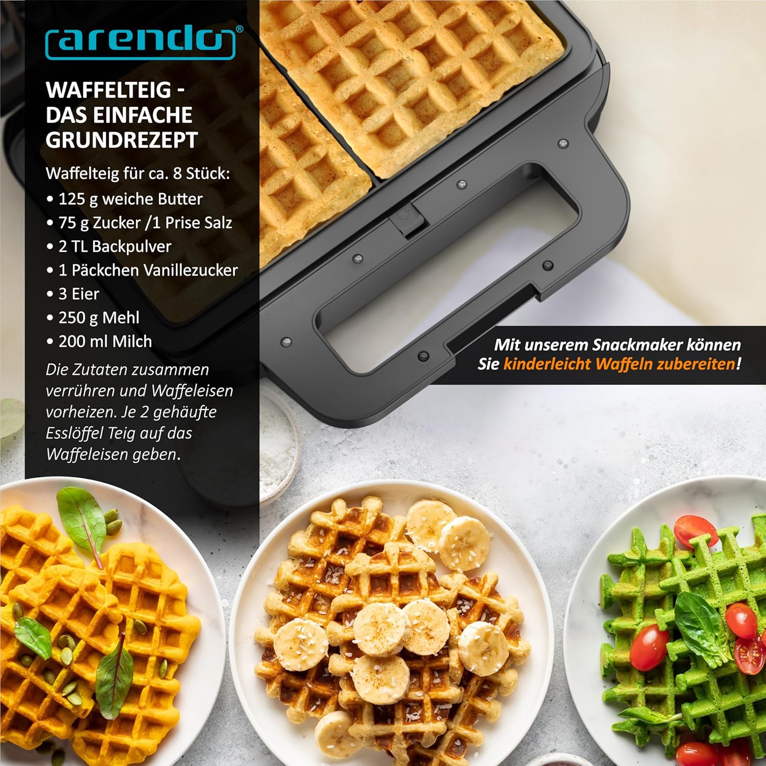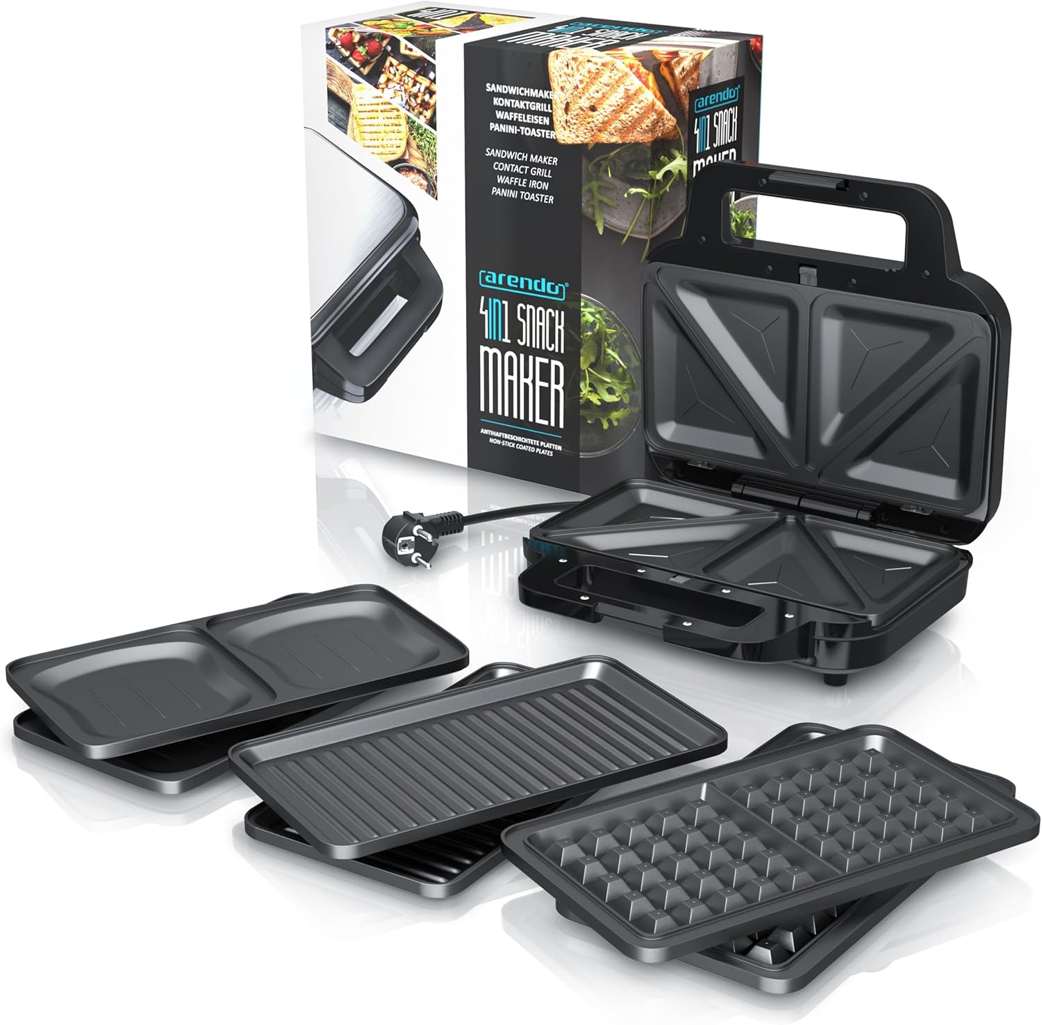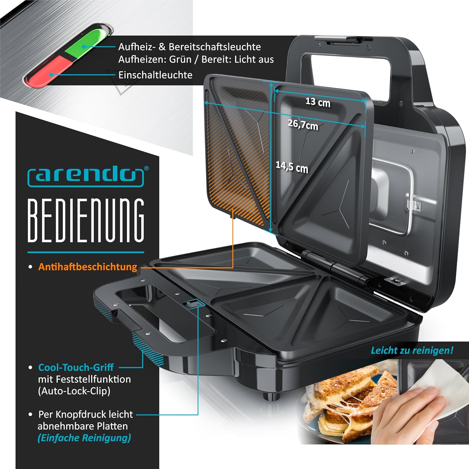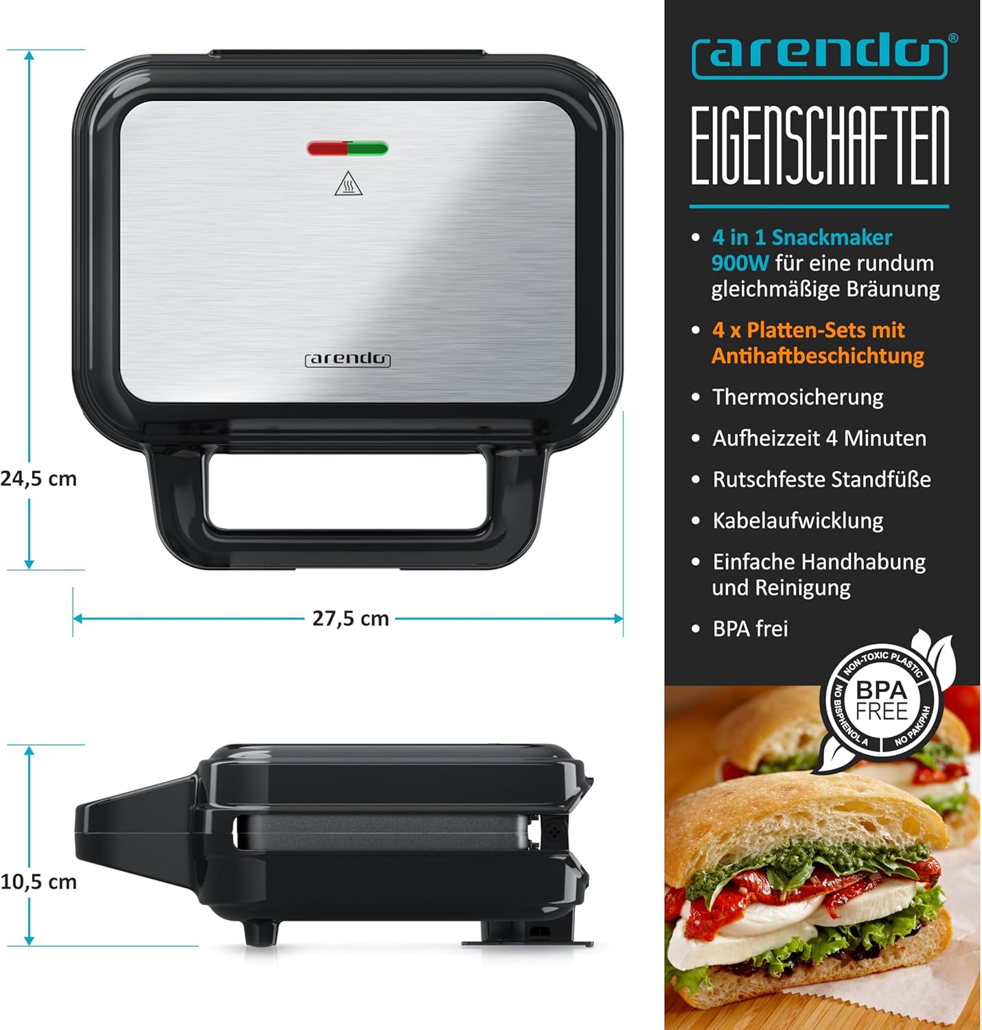 Сандвичник Arendo с подвижни плочи - Двоен гофретник - 4 в 1 - Панини, контактен грил - Незалепващо покритие - Без BPA - Контрол на температурата - Сандвичник - Тостер за сандвичи