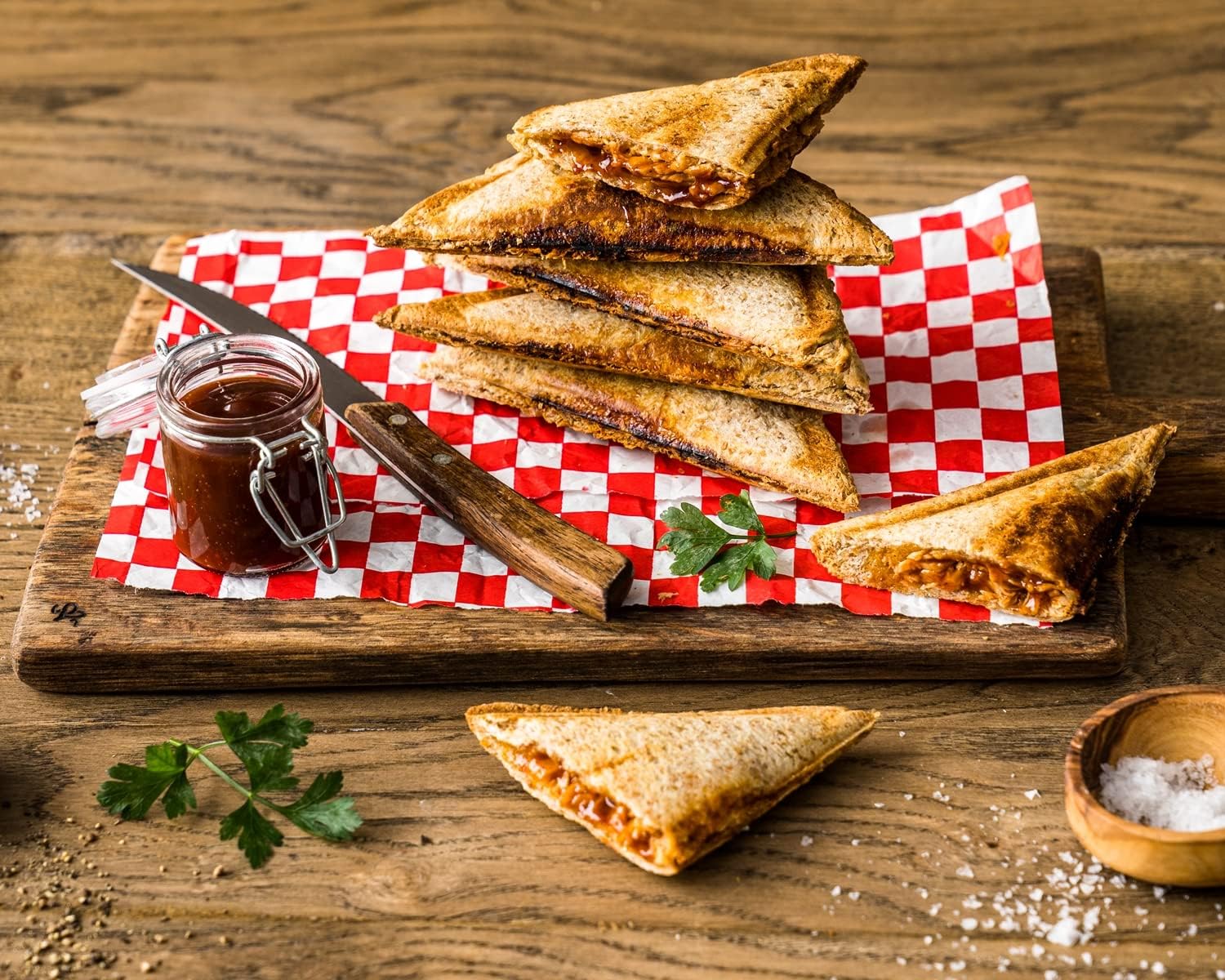 • Плътни алуминиеви плочи с корита за печене и разделители за 4 сандвича American XL (приблизително 12,5 x 12,5 см)