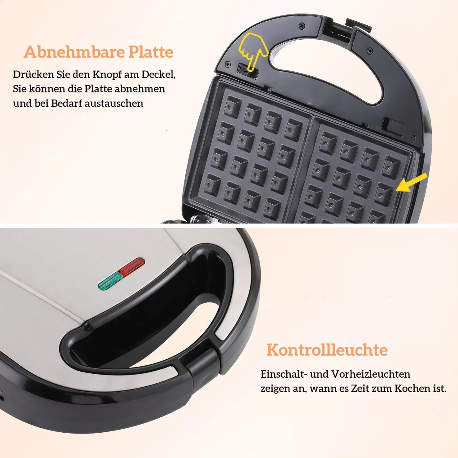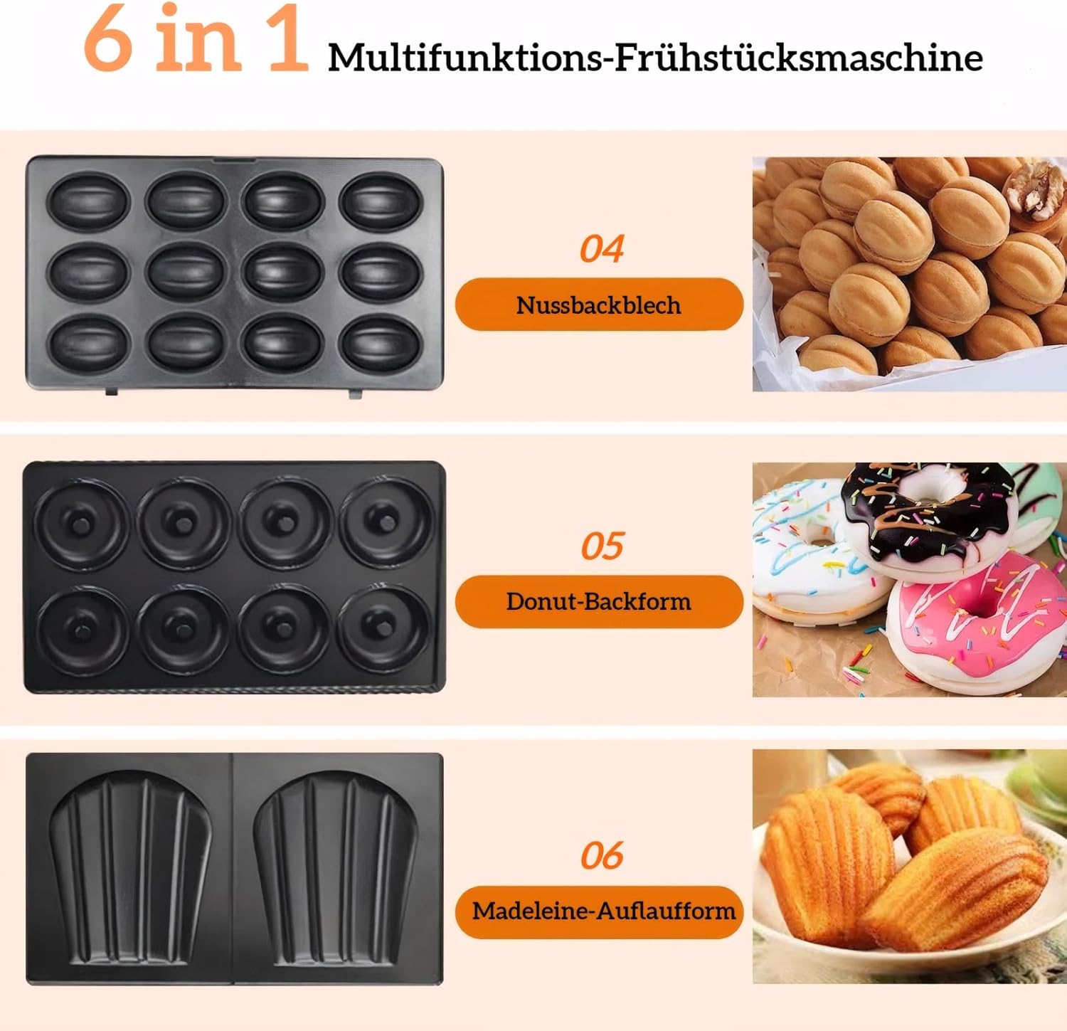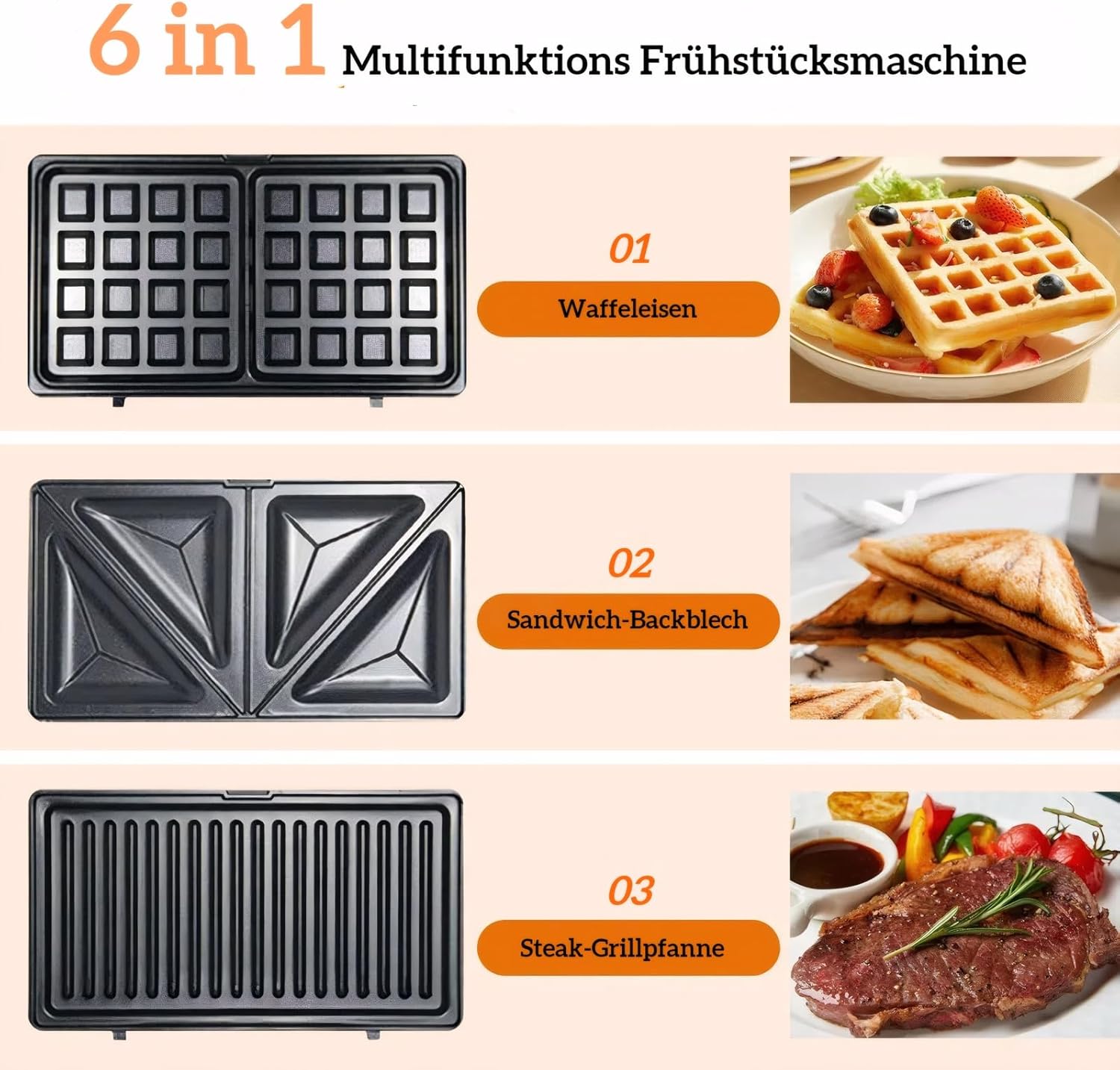 • 【МНОГОФУНКЦИОНАЛНОСТ В ЕДНО УСТРОЙСТВО】: Нашият многофункционален уред за приготвяне на сандвичи предлага 6 сменяеми чинии (гофрети, пържоли, понички, сандвичи, мадленки, ядки). Идеален за разнообразни идеи за закуска.