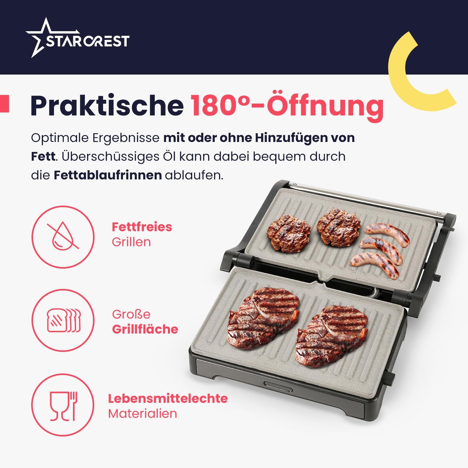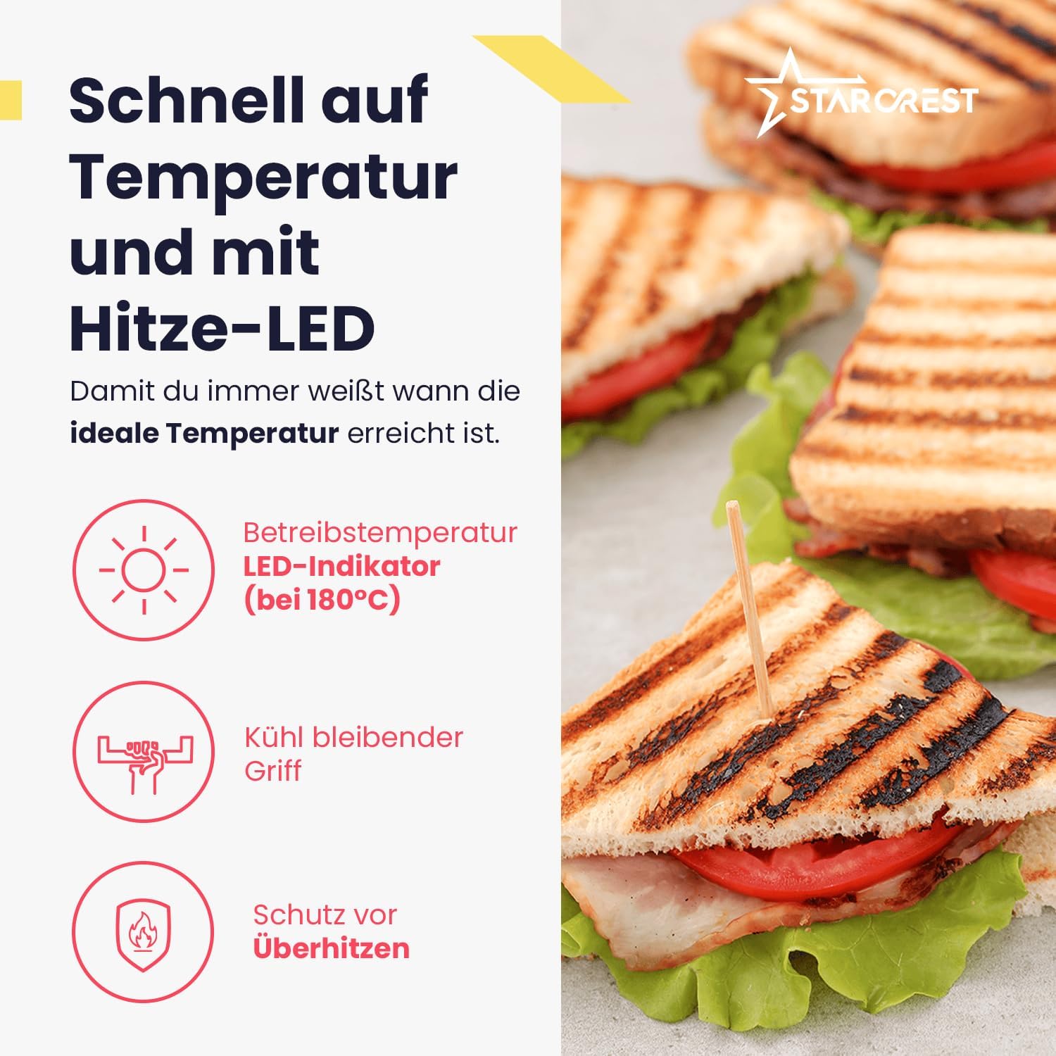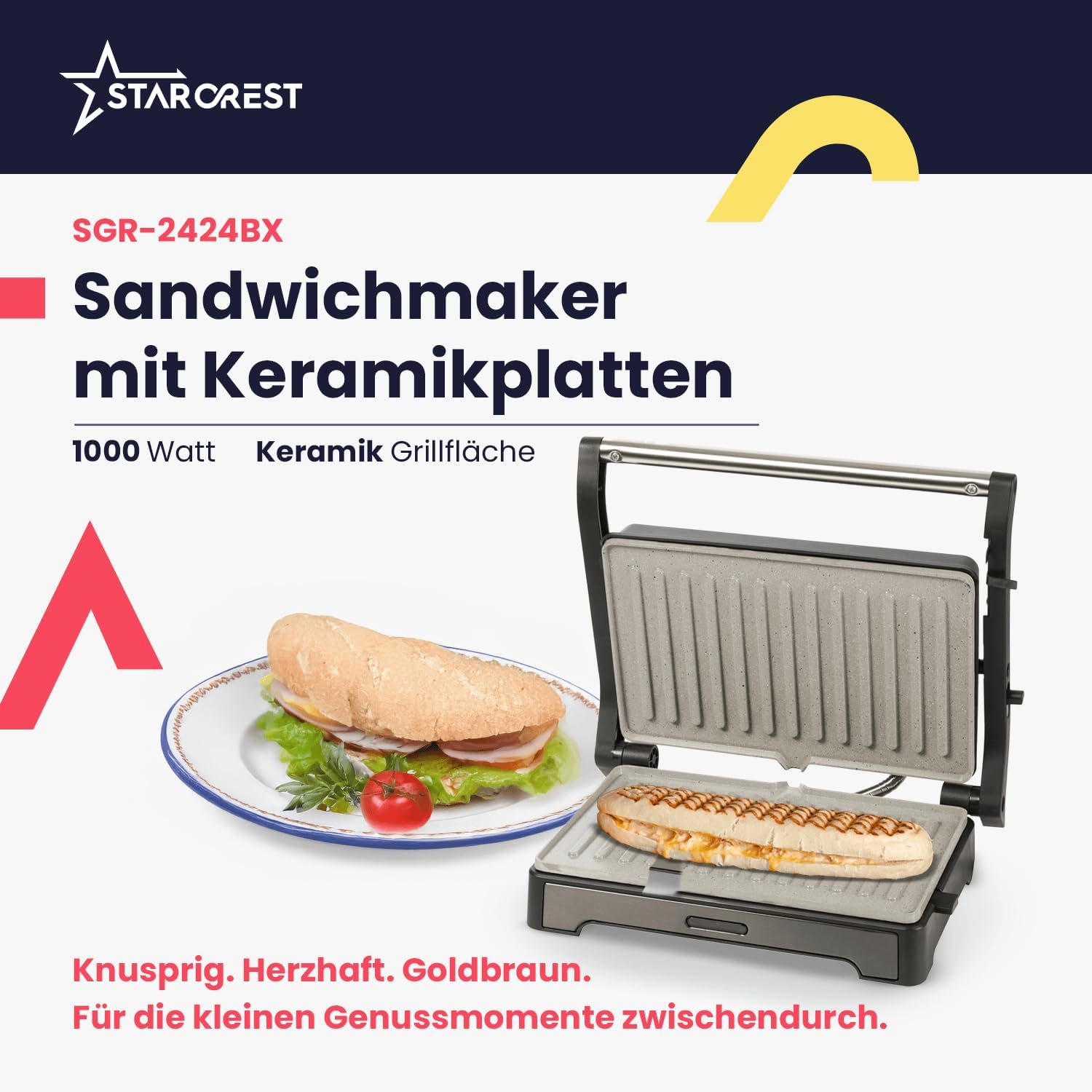 Сандвичница STARCREST с отваряне на 180° във формат контактна скара или панини скара, 23 x 15 см, незалепващо покритие за тостер за сандвичи с керамични плочи за сандвичи, месо и зеленчуци, 1000 W, LED осветление