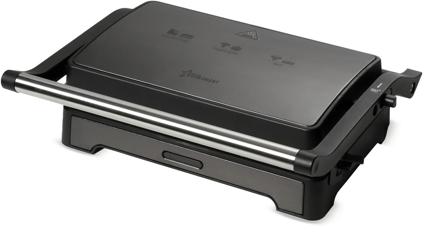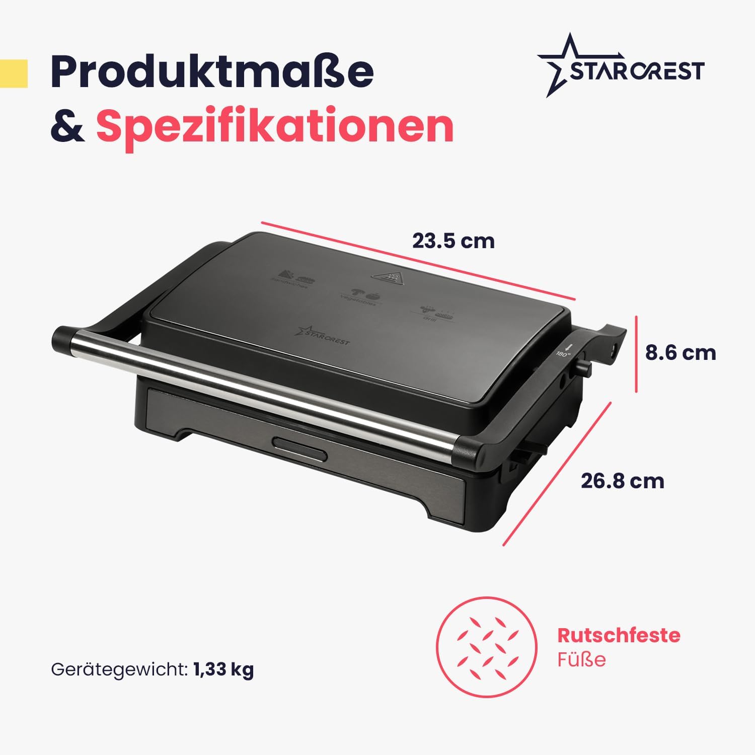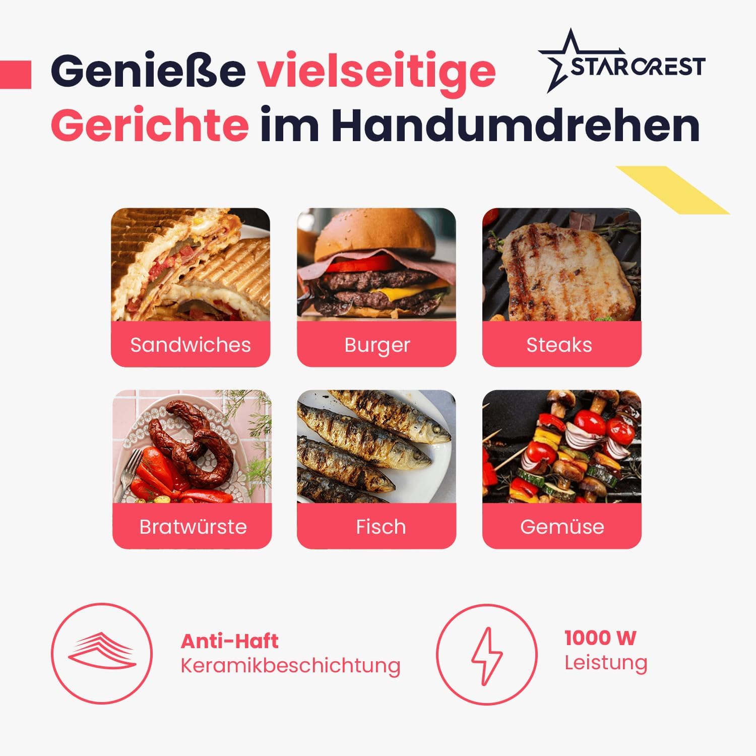 Сандвичница STARCREST с отваряне на 180° във формат контактна скара или панини скара, 23 x 15 см, незалепващо покритие за тостер за сандвичи с керамични плочи за сандвичи, месо и зеленчуци, 1000 W, LED осветление