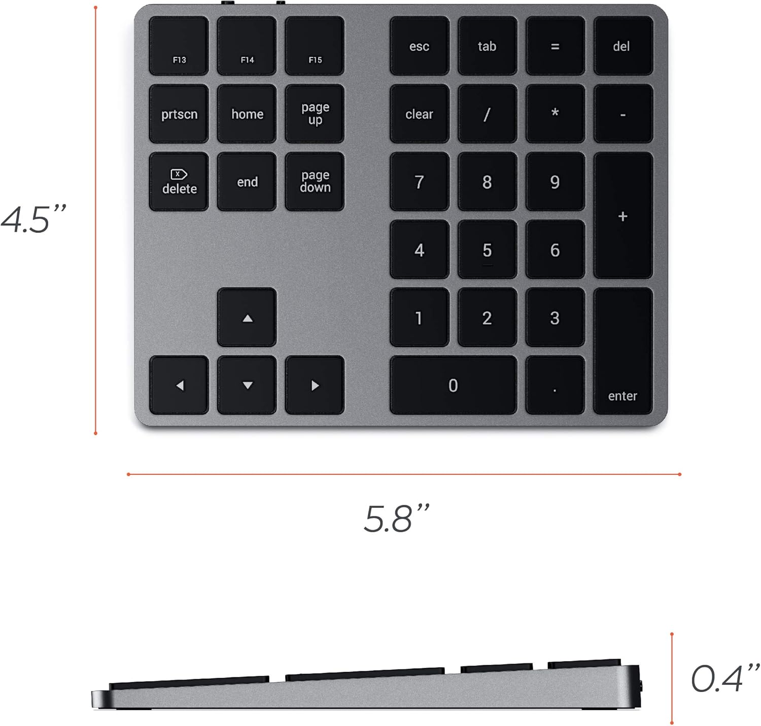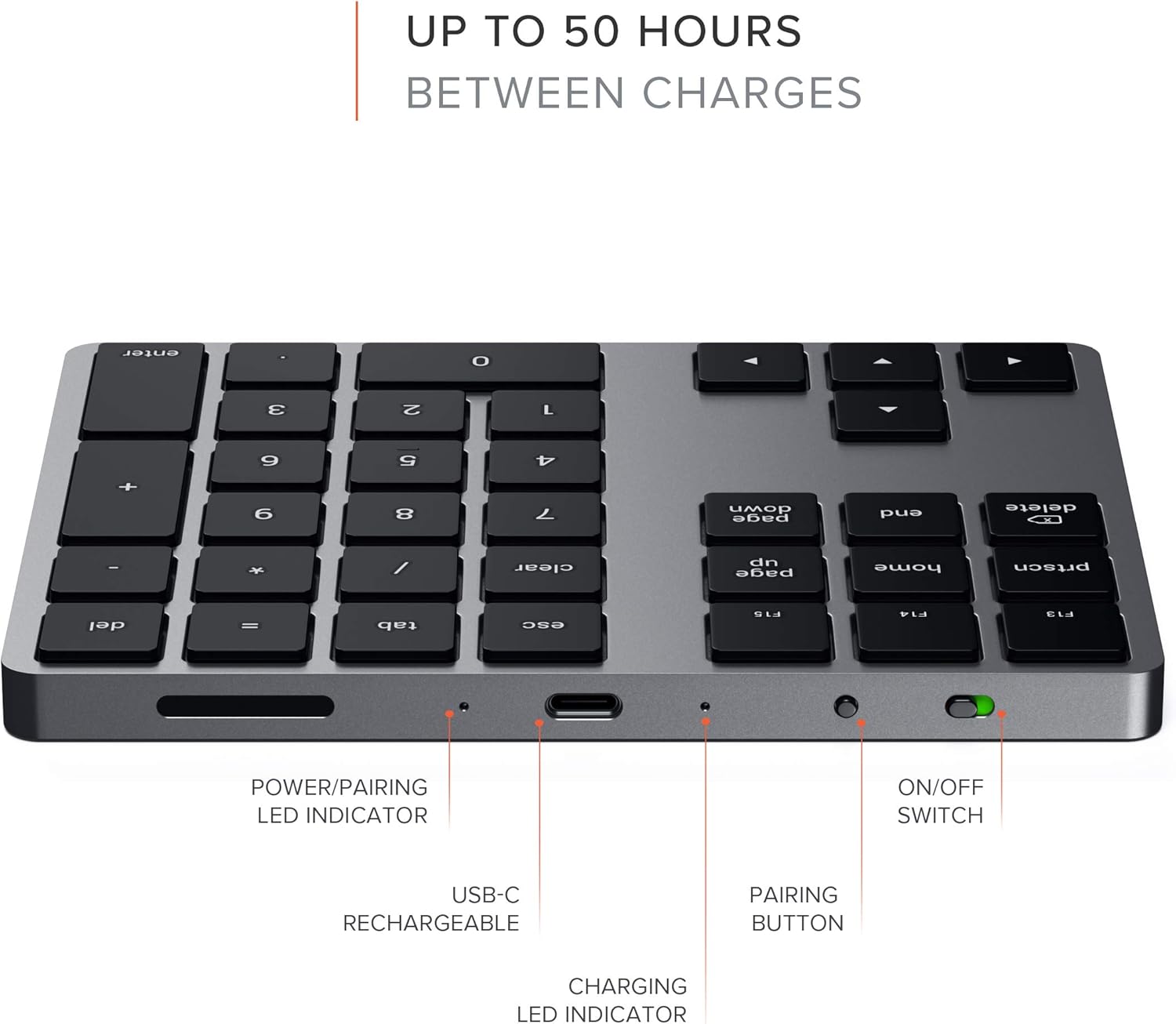 SATECHI Bluetooth разширена цифрова клавиатура 34 клавиша с американско оформление, презареждаща се алуминиева цифрова клавиатура за MacBook Air & Pro M4 M3, Mac Mini, iMac, iPad, iPhone и други - космическо сиво