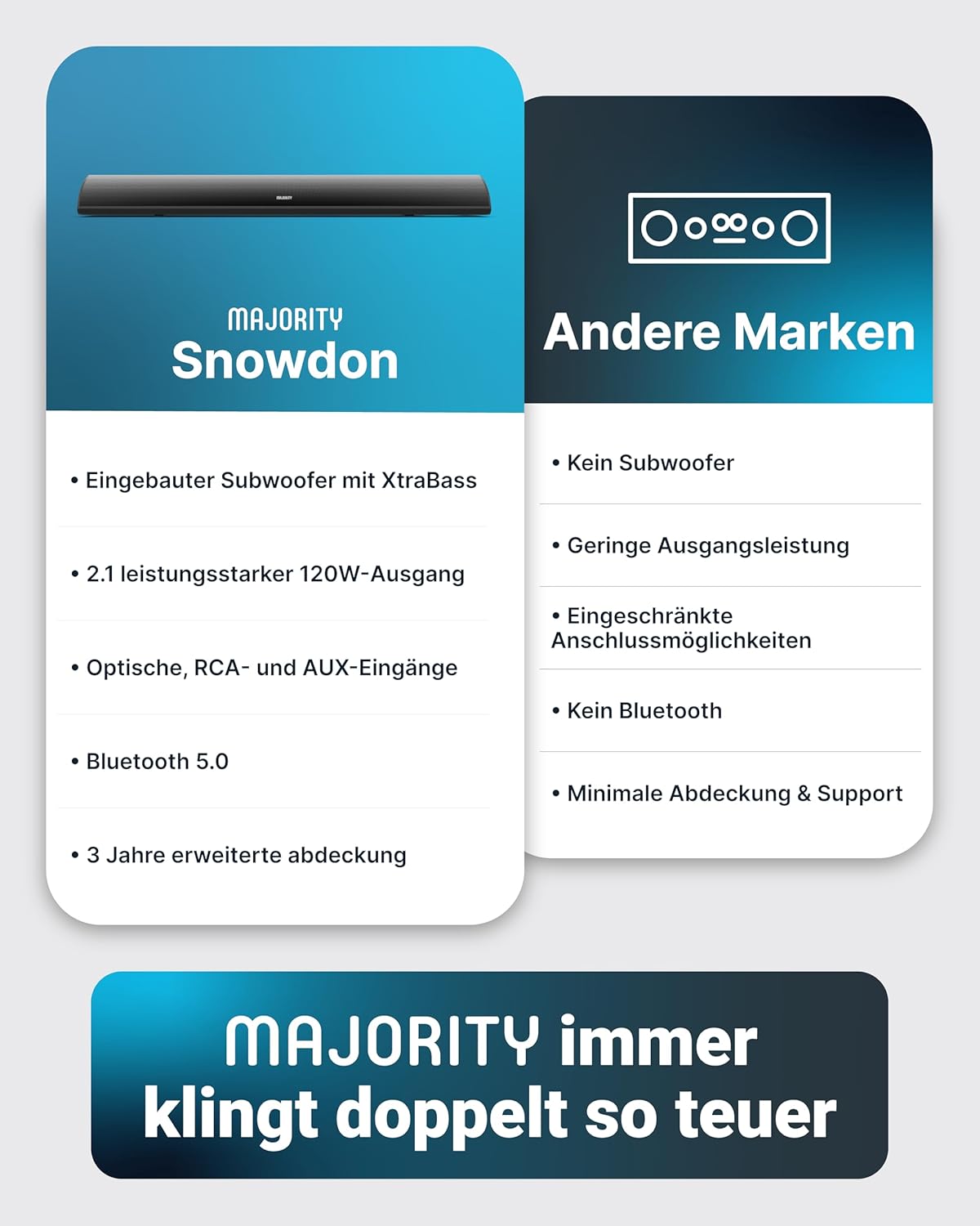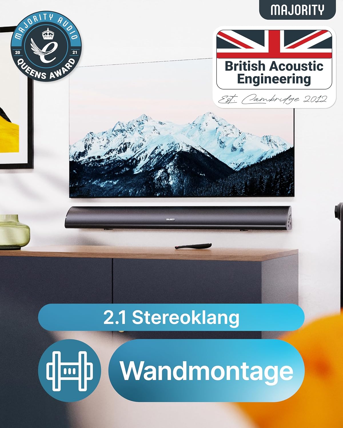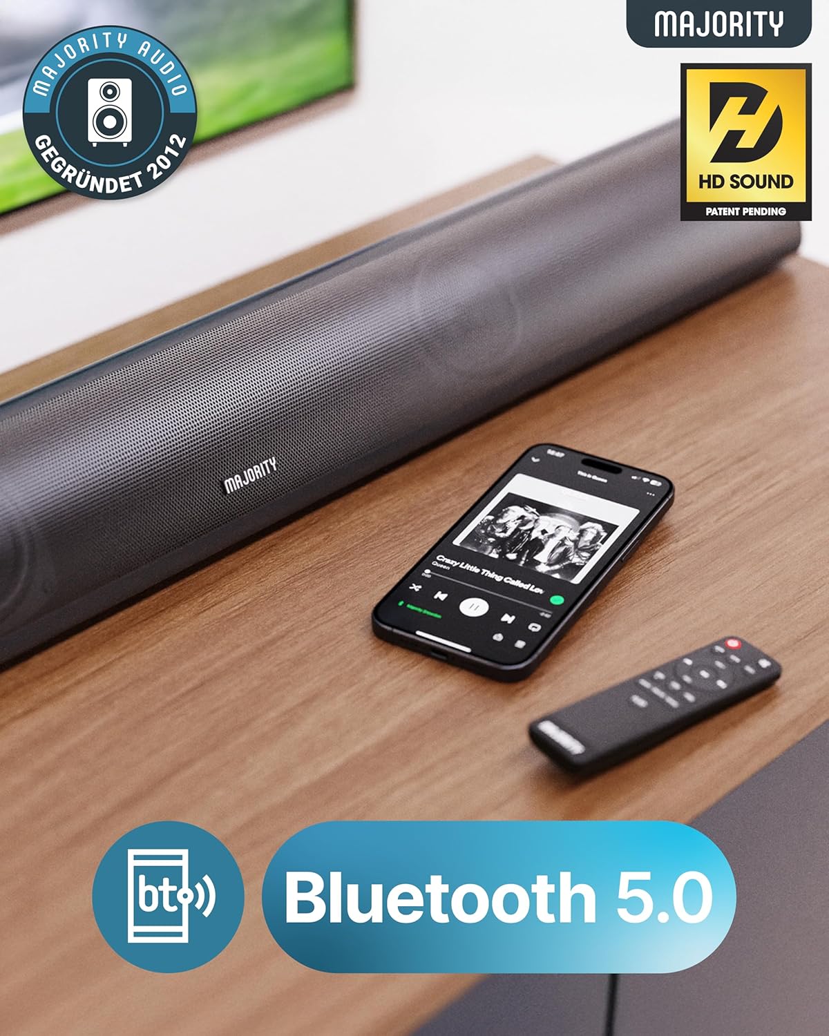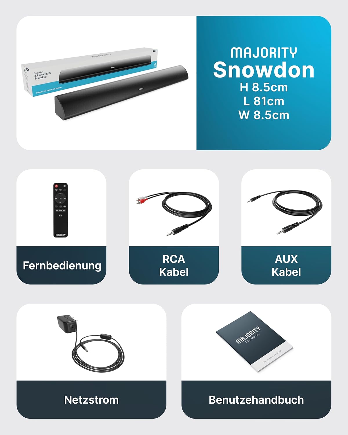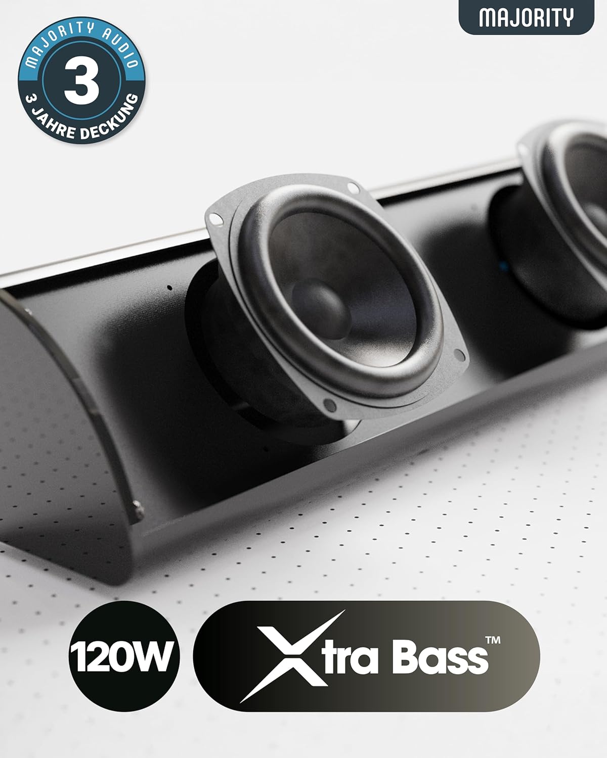 Саундбар Snowdon II с вграден съраунд звук за субуфер, 120W безжично 5.0 Bluetooth устройство, стрийминг, голямо дистанционно, възможност за стенен монтаж, оптично съвместим, RCA кабел включен.