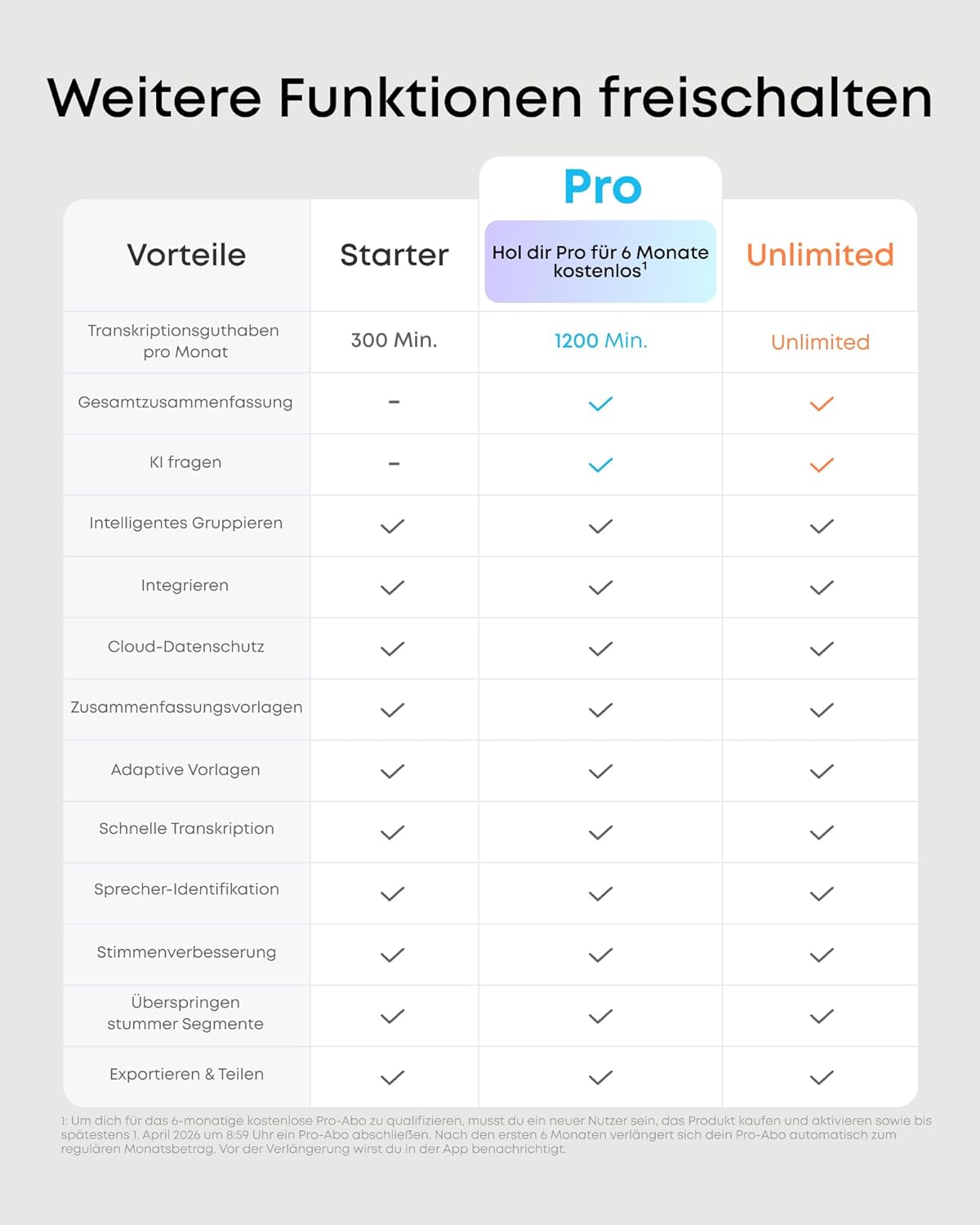 • Новите потребители, които закупят месечен Pro абонамент не по-късно от 1 април 2026 г. в 8:59 ч., ще получат 6-месечен безплатен пробен период. След пробния период абонаментът се подновява автоматично от 7-ия месец на редовна месечна цена. Потребителите могат да го анулират по всяко време преди датата на фактуриране. След първо свързване на устройството, потребителите автоматично стават начинаещи членове и получават 300 минути транскрипция на месец. Когато потребител премине към платен план, начинаещото членство се паузира и автоматично се активира отново след изтичане на платения абонамент.
