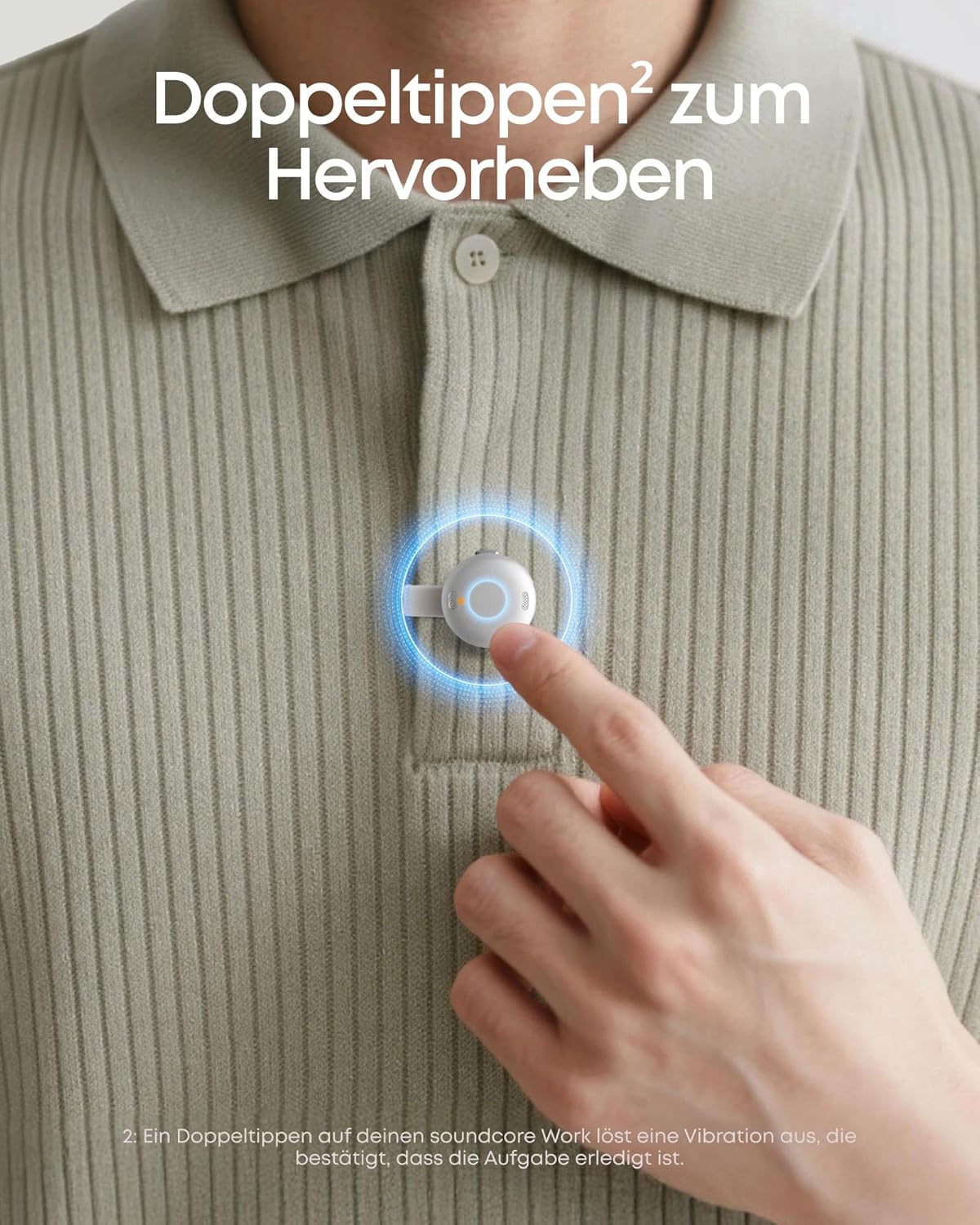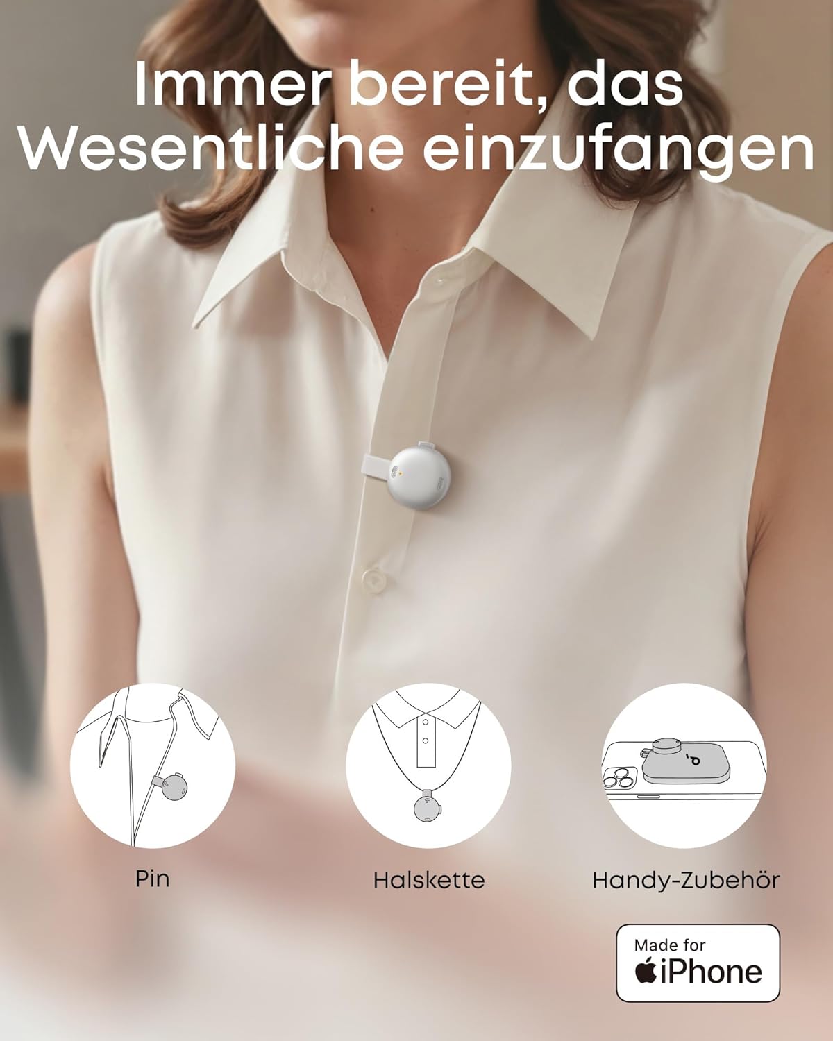• Записвайте веднага: С тегло само 10 г и диаметър 23,2 мм, рекордерът може да се прикрепи към дрехи, да се окачи на врата ви или да се закачи зареждащата кутия (включително микро) към мобилния ви телефон. Записът започва веднага само с едно натискане на бутон.