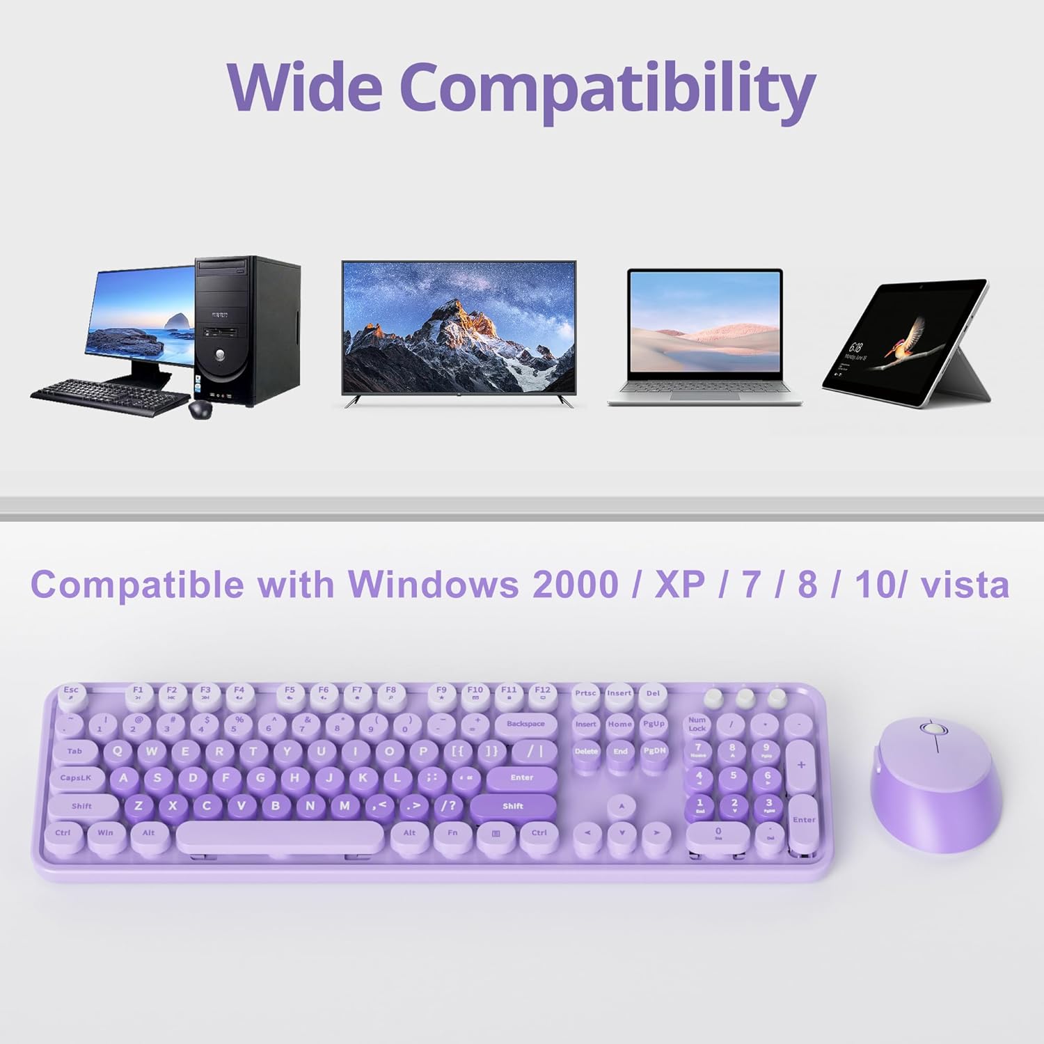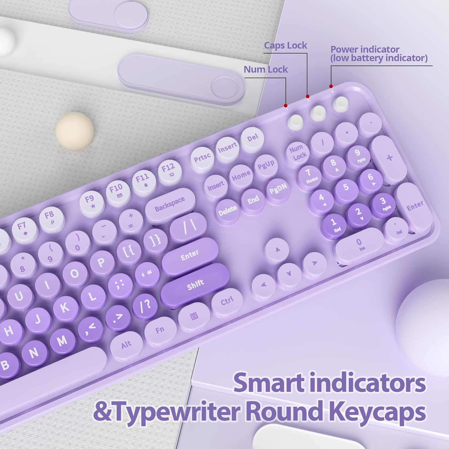 SbocKeeb Сладка безжична клавиатура и мишка, американска QWERTY, 104 клавиатура за пишеща машина, пълен размер, 2.4 GHz цветен комплект клавиатура и мишка с ретро кръгли клавиши, градиентно лилаво