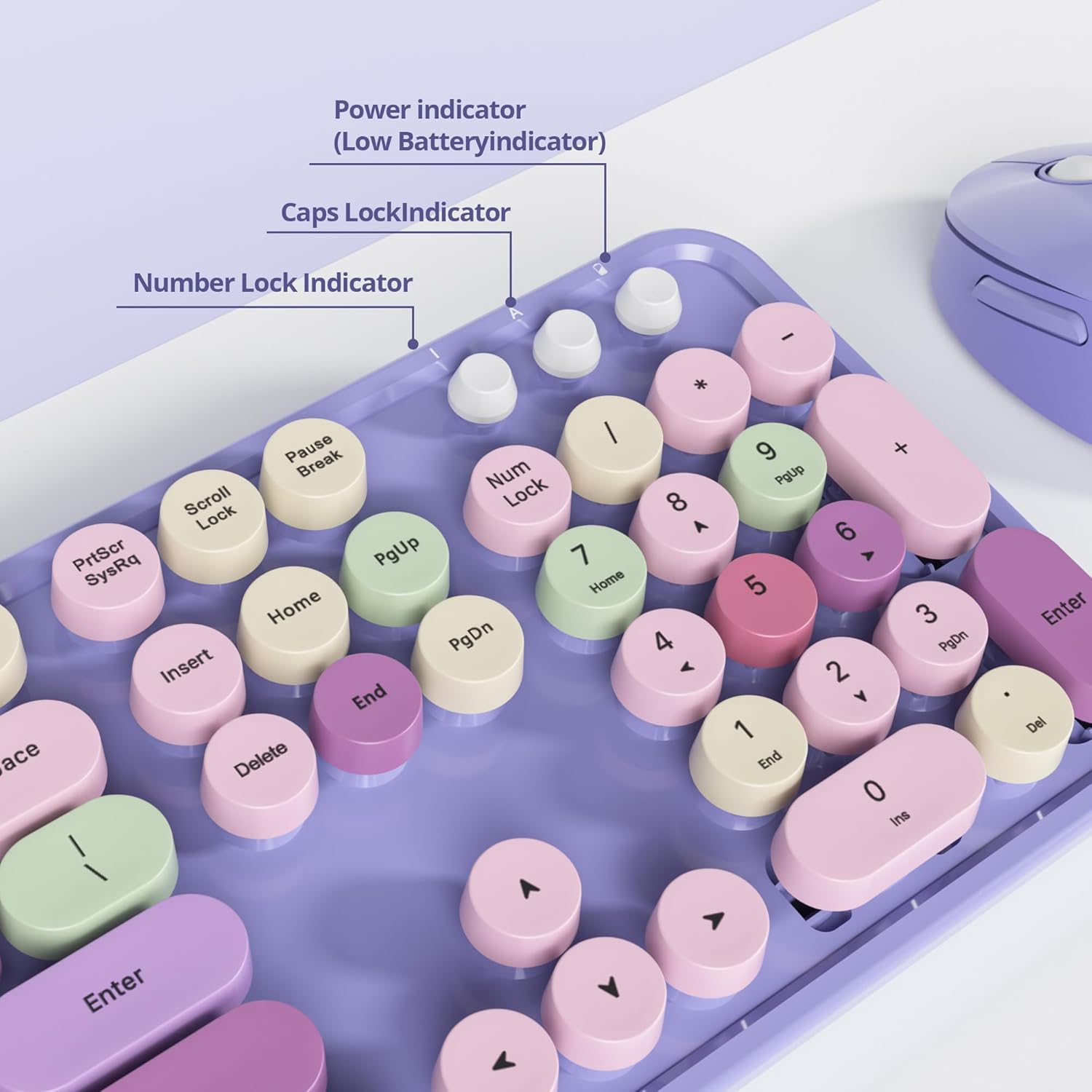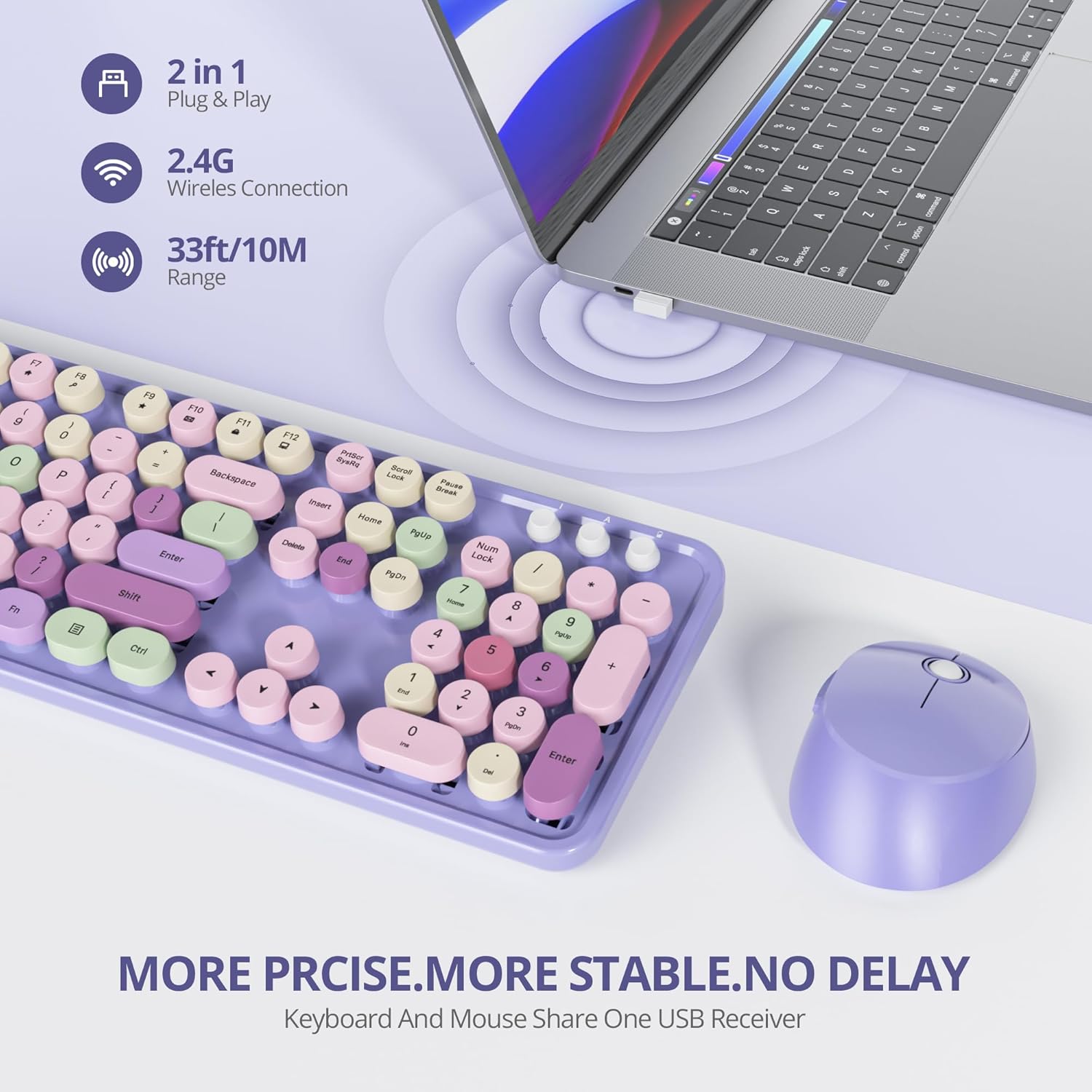 SbocKeeb Сладка безжична клавиатура и мишка, американска QWERTY, 104 клавиатура за пишеща машина, пълен размер, 2.4 GHz цветен комплект клавиатура и мишка с ретро кръгли клавиши, цветно лилаво