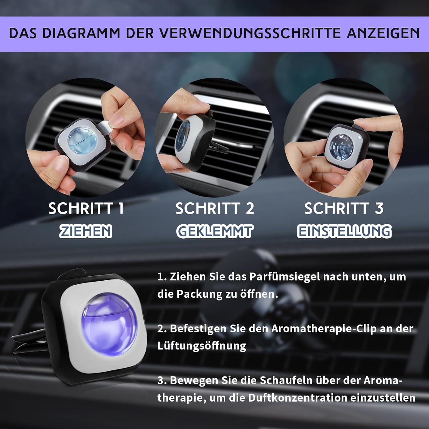 • Лесен за употреба: Отлепете парфюмното фолио, за да отворите опаковката, след което прикрепете ароматната щипка към вентилационния отвор. Накрая, преместете лопатката, за да регулирате концентрацията на аромата. Той освобождава освежаващ аромат с въздушния поток, което ви позволява да се наслаждавате на свежа и приятна атмосфера в колата си по всяко време. Подходящ за всички видове автомобили.