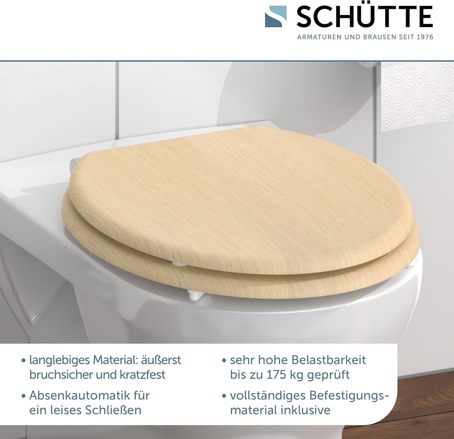 SCHÜTTE Тоалетна чиния Natural с механизъм за плавно затваряне, Тоалетна чиния с капак, Дървен капак с мотив (Максимално натоварване на тоалетната чиния: 175 кг), Дърво