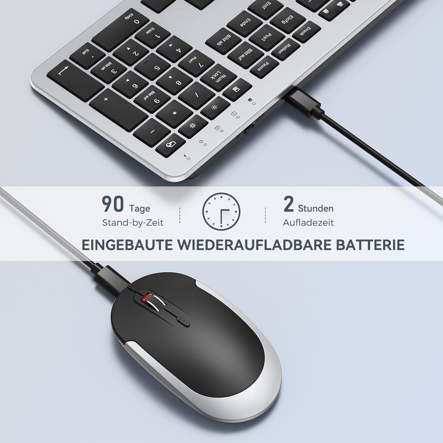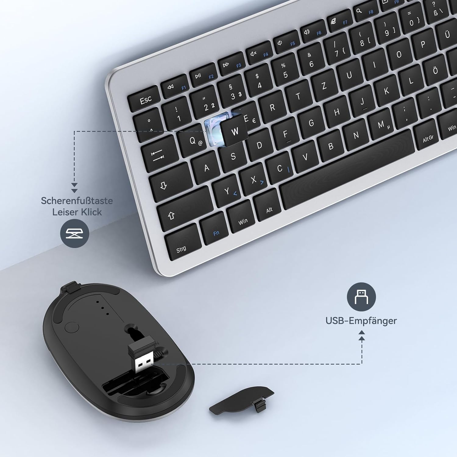 seenda SK38-3 Безжичен комплект клавиатура и мишка, Ултратънък комплект безжична клавиатура и мишка с презареждаща се батерия, Ергономична безжична клавиатура със силиконов капак за компютър/лаптоп/телевизор, DE QWERTZ оформление, Черно и сребристо