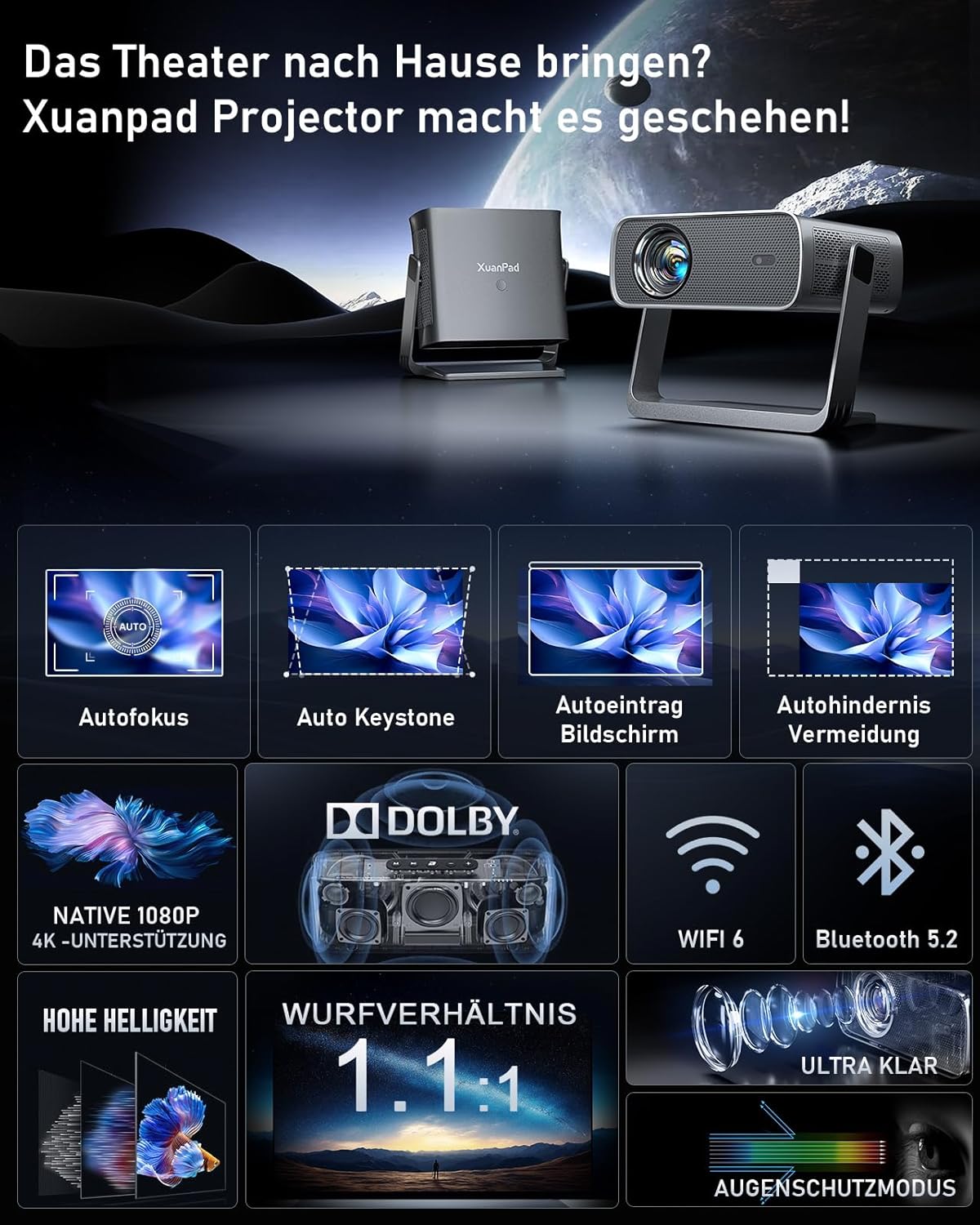[Сертифициран от Netflix и AI автофокус] XuanPad проектор с WiFi и Bluetooth 30000L 1080P проектор, въртяща се на 210° стойка, автоматична корекция на трапецовидно изкривяване, отстраняване на прах и разсейване на топлината