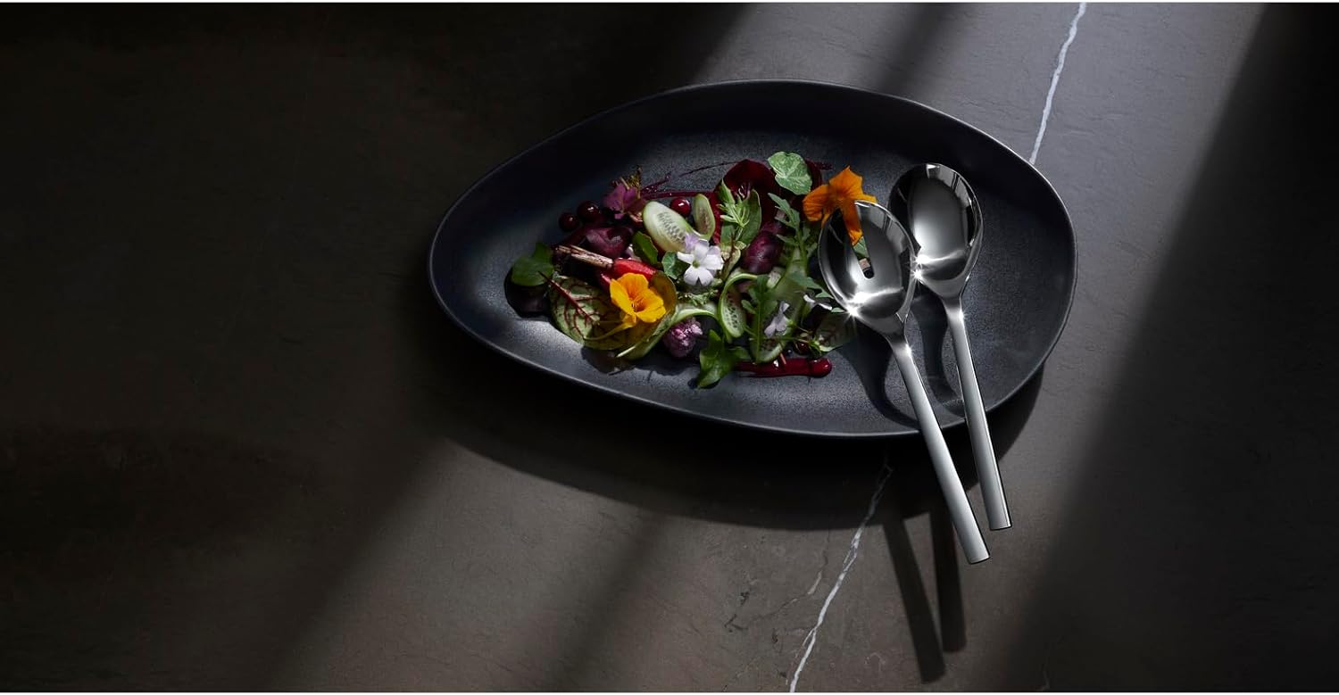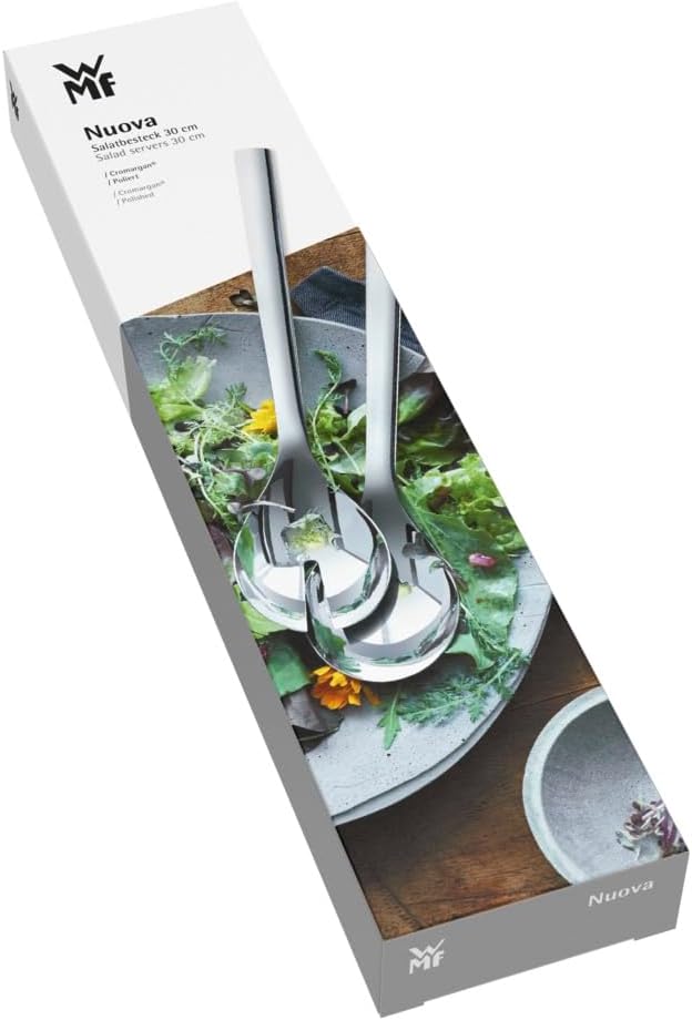 Сервиращи кутии за салата WMF Nuova 30 см, големи, с вилица за салата и лъжица за сервиране, полирана неръждаема стомана Cromargan, подходящи за съдомиялна машина