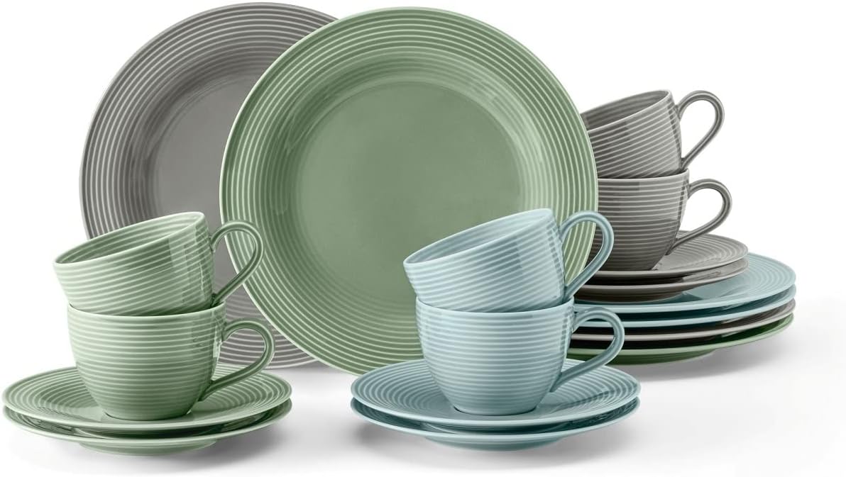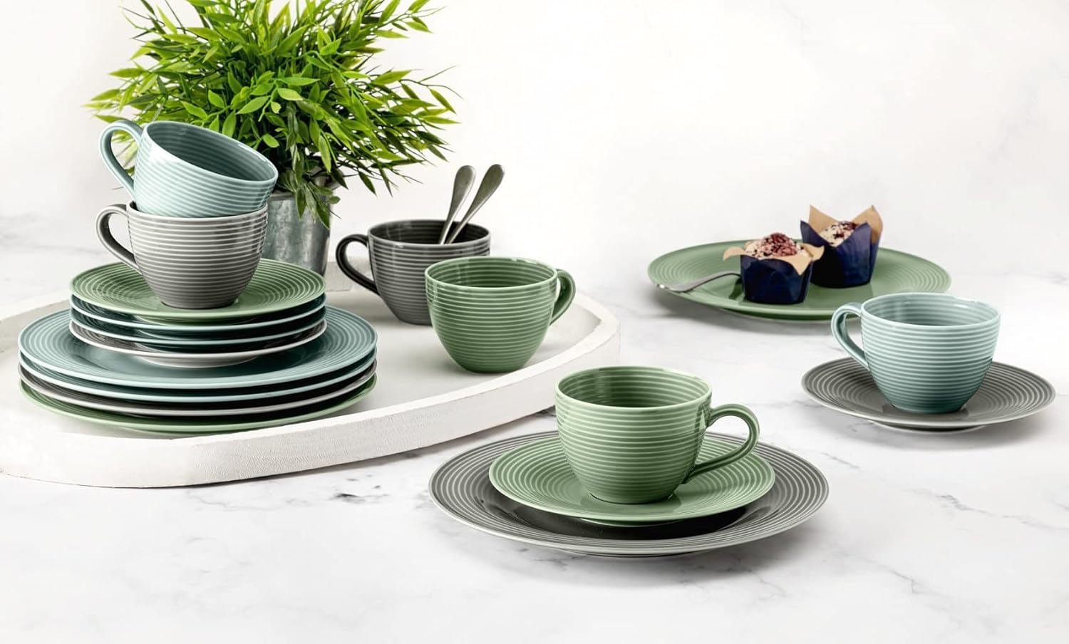 • Само при нас ще получите комплект, състоящ се от: 2x чаши за кафе, всяка в (перлено сиво, арктическо синьо, градински зелено), 2x комбинирани чинийки, всяка в (перлено сиво, арктическо синьо, градински зелено), 2x чинии за закуска, всяка в (перлено сиво, арктическо синьо, градински зелено)