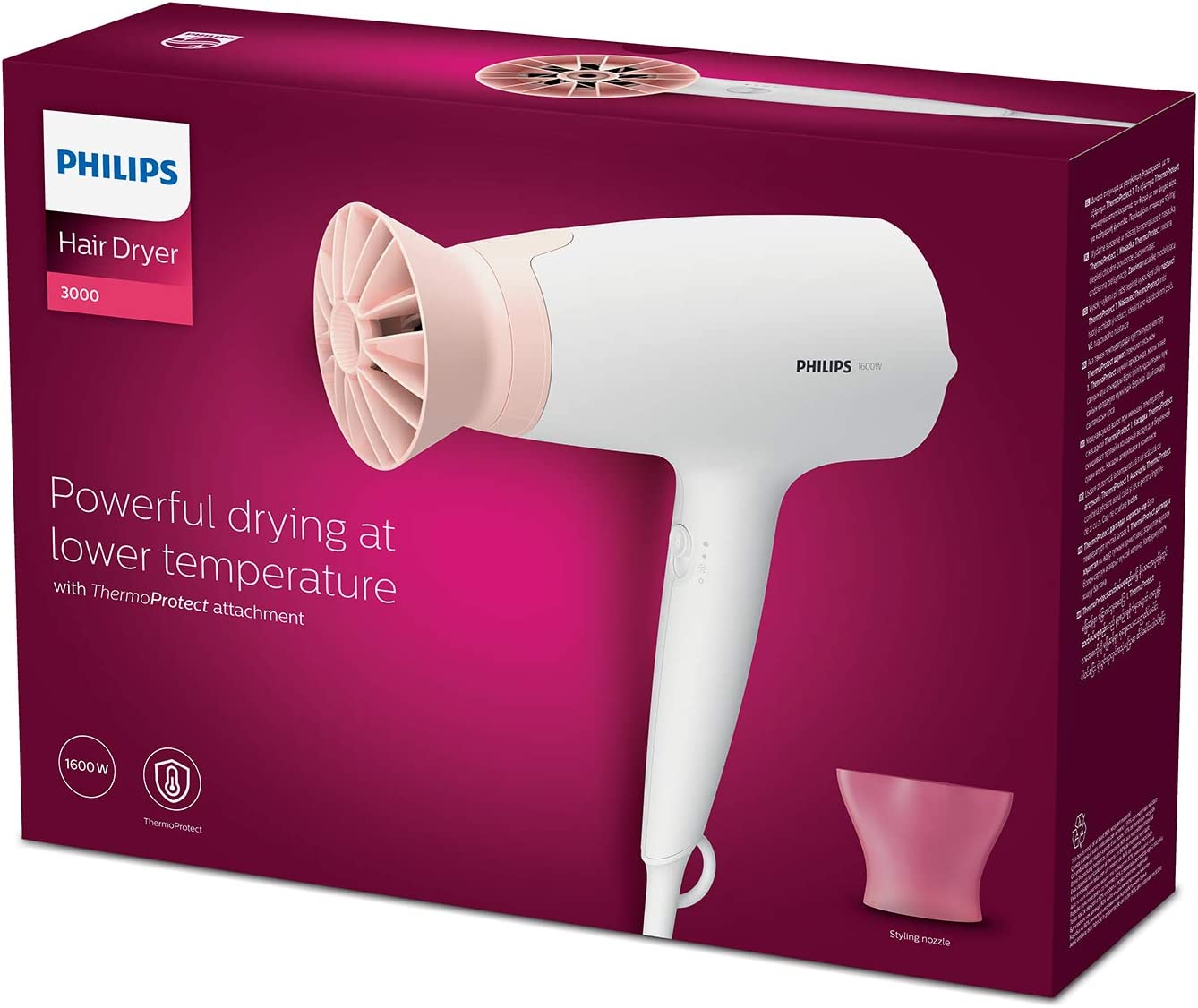 • Сешоарът Philips Series 3000 с приставка ThermoProtect има мощен 1600 W мотор за мощно сушене и перфектни резултати при стилизиране