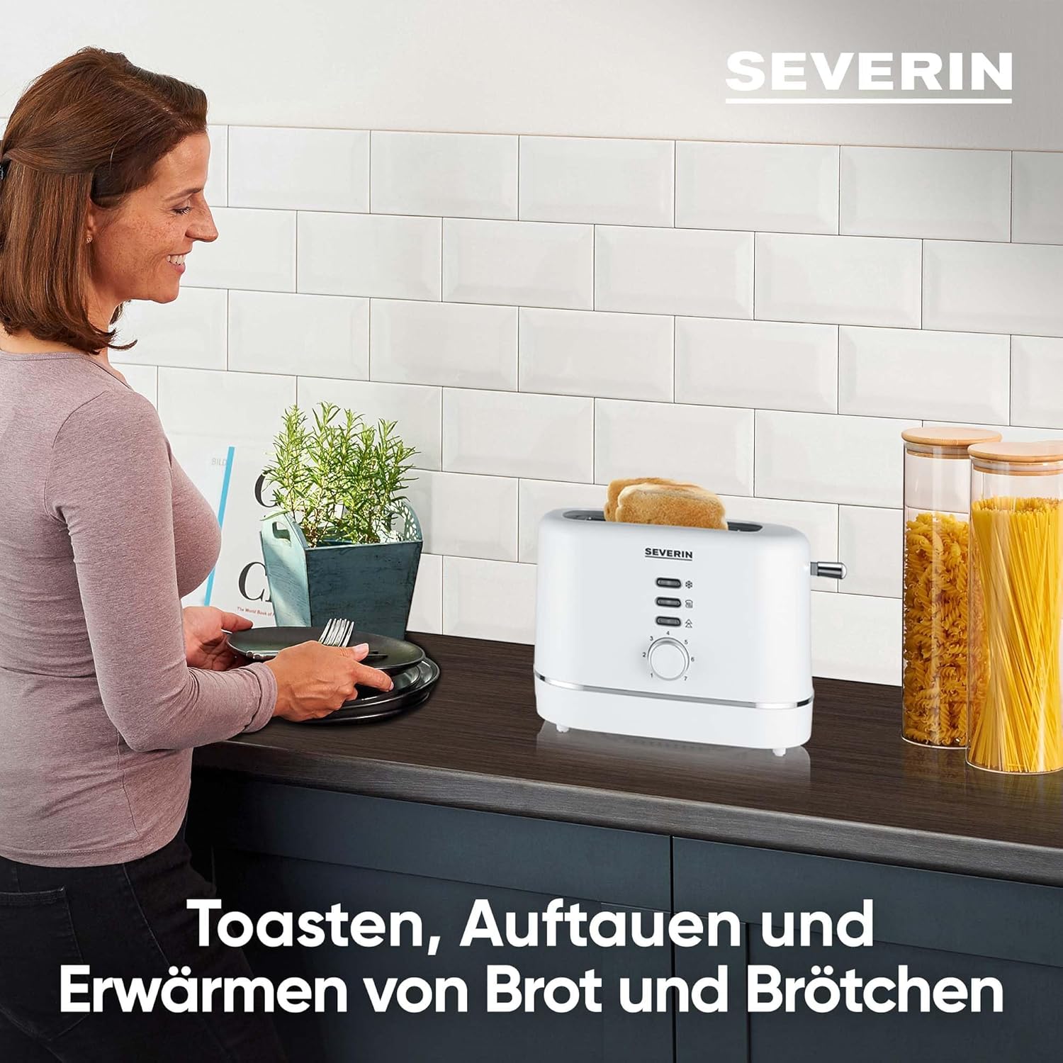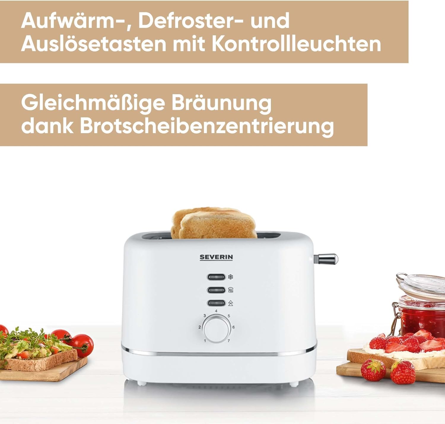 SEVERIN Автоматичен тостер, за 2 филийки, приставка за хлебчета от неръждаема стомана, функция за загряване и размразяване, регулируема степен на изпичане, автоматично изключване, 850 W, бял, AT 4324