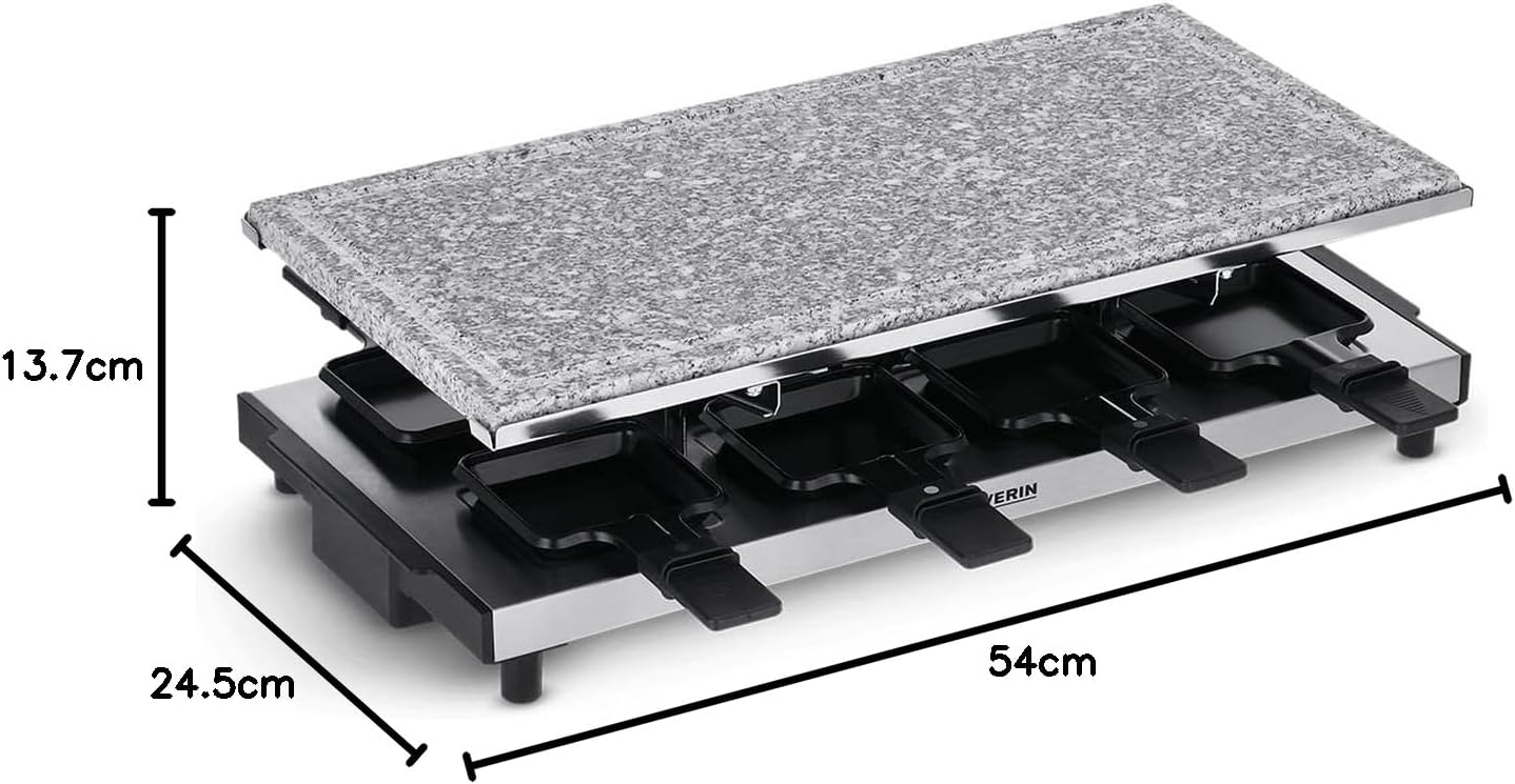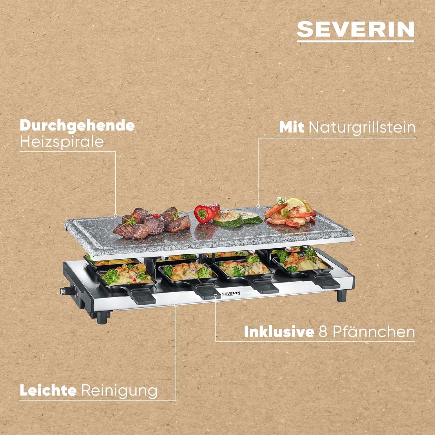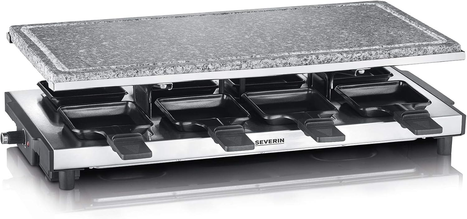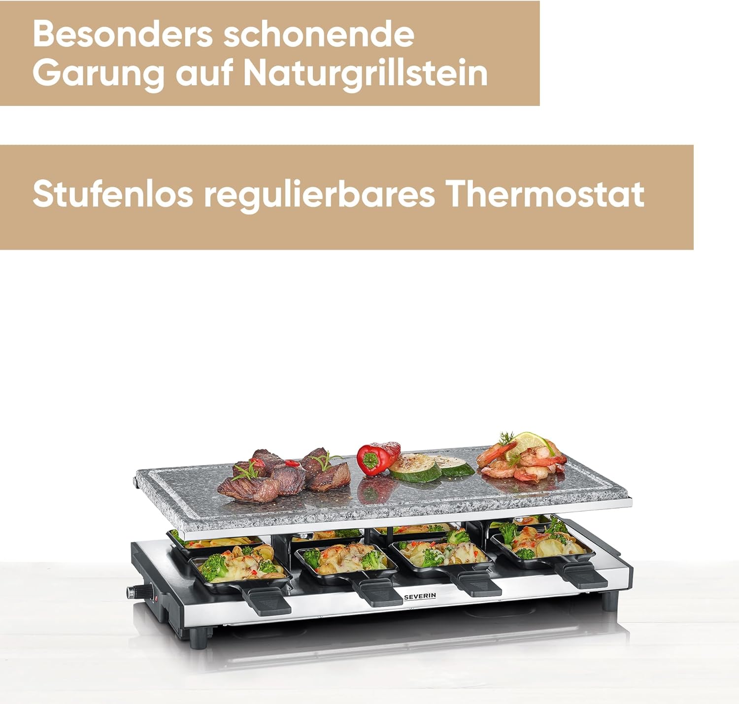 SEVERIN Раклет с естествен камък за грил, Електрическа настолна скара, Раклет за 8 души с плоча за грил и 8 тигана, Пластмаса/Неръждаема стомана, Черен, RG 2374