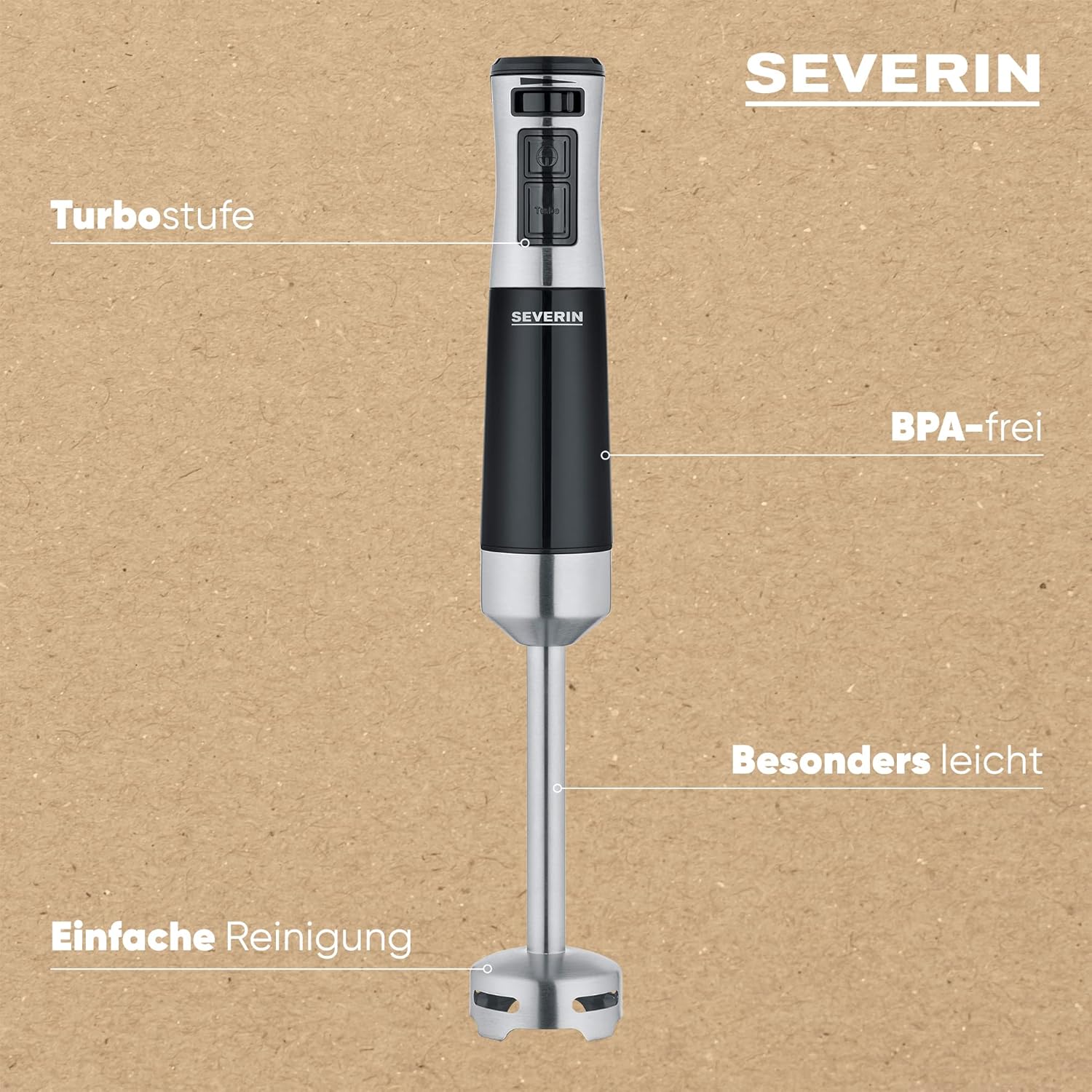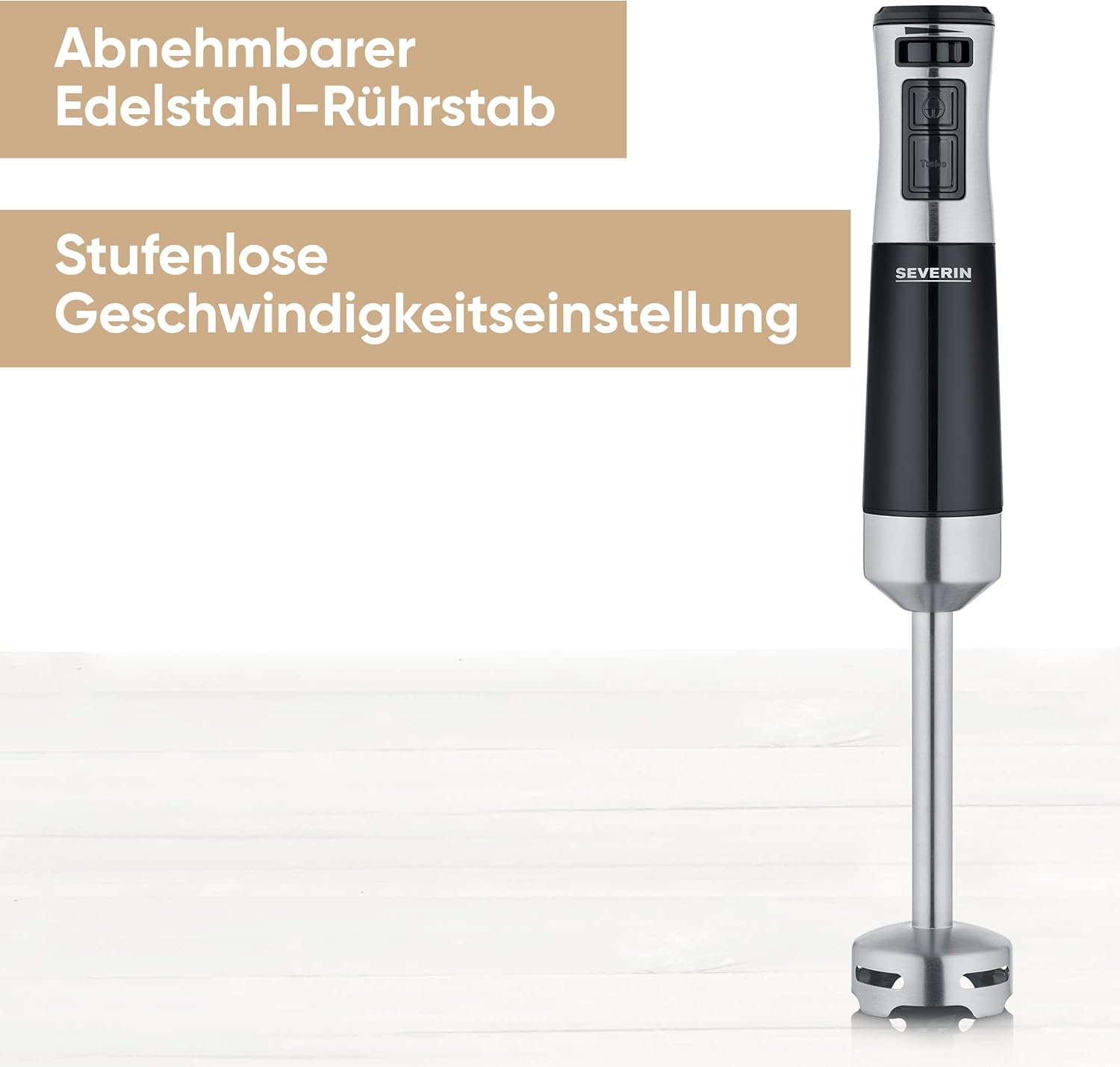 SEVERIN SM 3771 Ръчен блендер за пюриране и нарязване, смесителна щанга с плавно регулиране на скоростта, подвижна пюре щанга, 600 W, черна/матирана неръждаема стомана