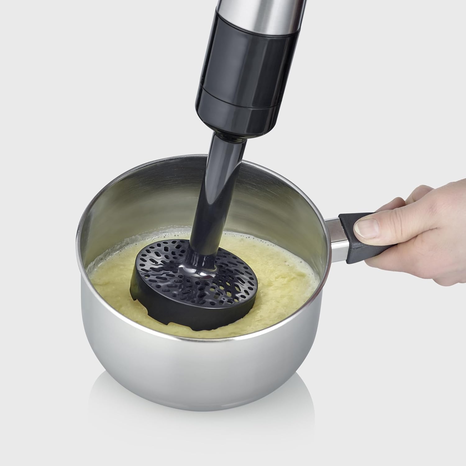 SEVERIN SM 3775 Безжичен ръчен блендер с Premium Set, подвижна смесителна пръчка, с пюре, мулти-чопър, контейнер за смесване, преса за картофи и бъркалка, черна/матирана неръждаема стомана