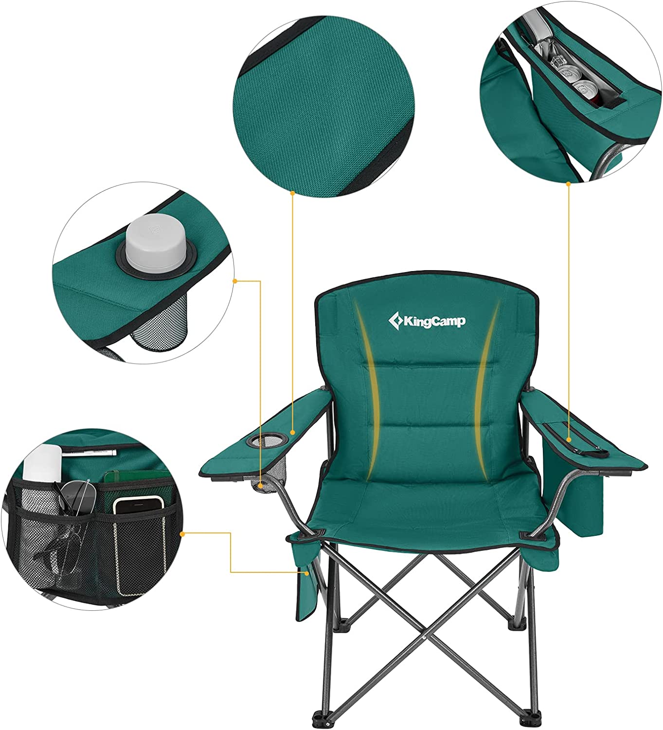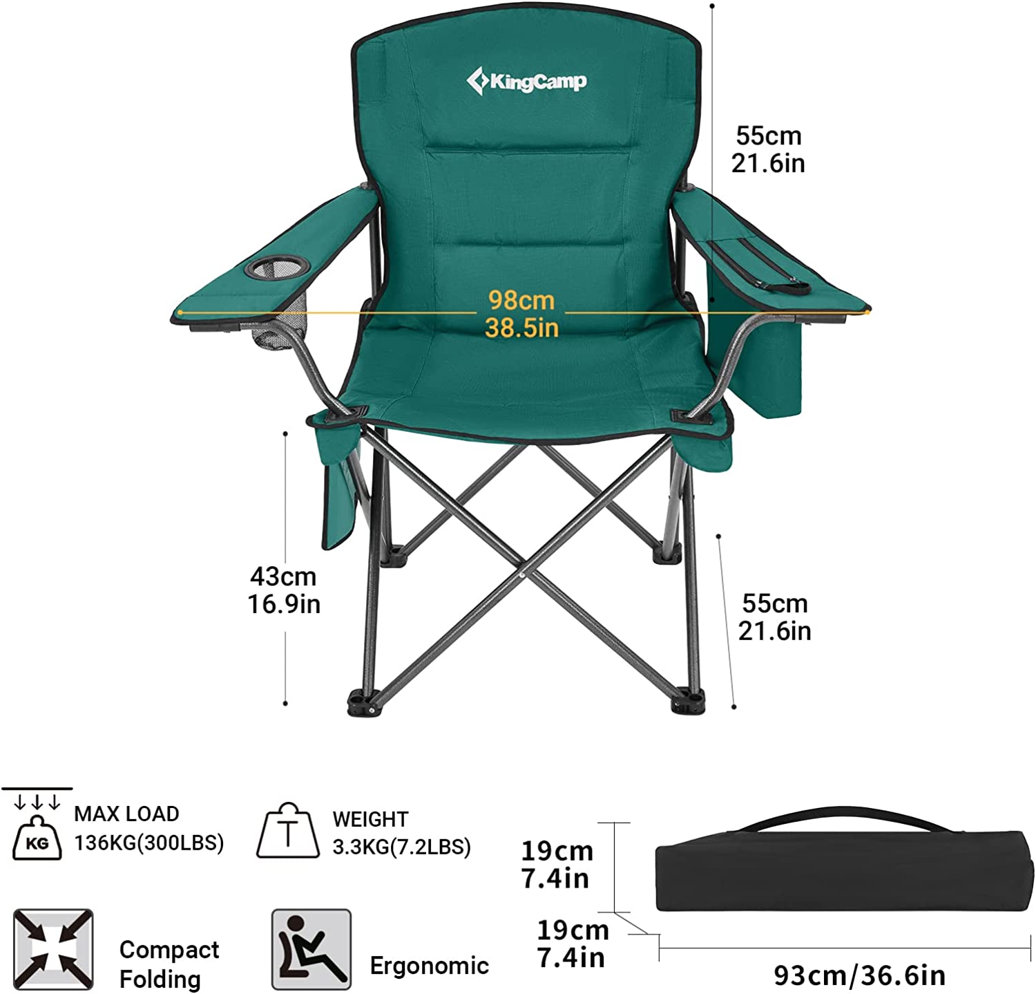 Сгъваем стол за къмпинг KingCamp, Издържа до 136кг, Поставка за напитки, Включва чанта за съхранение, Зелен
