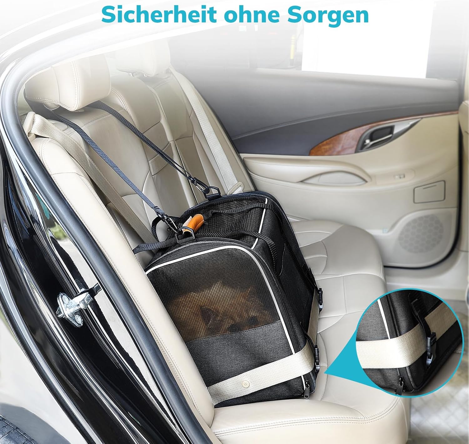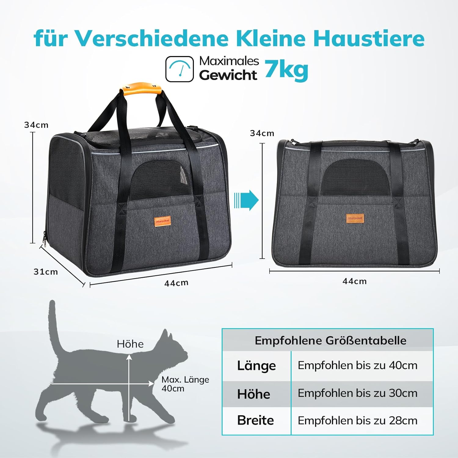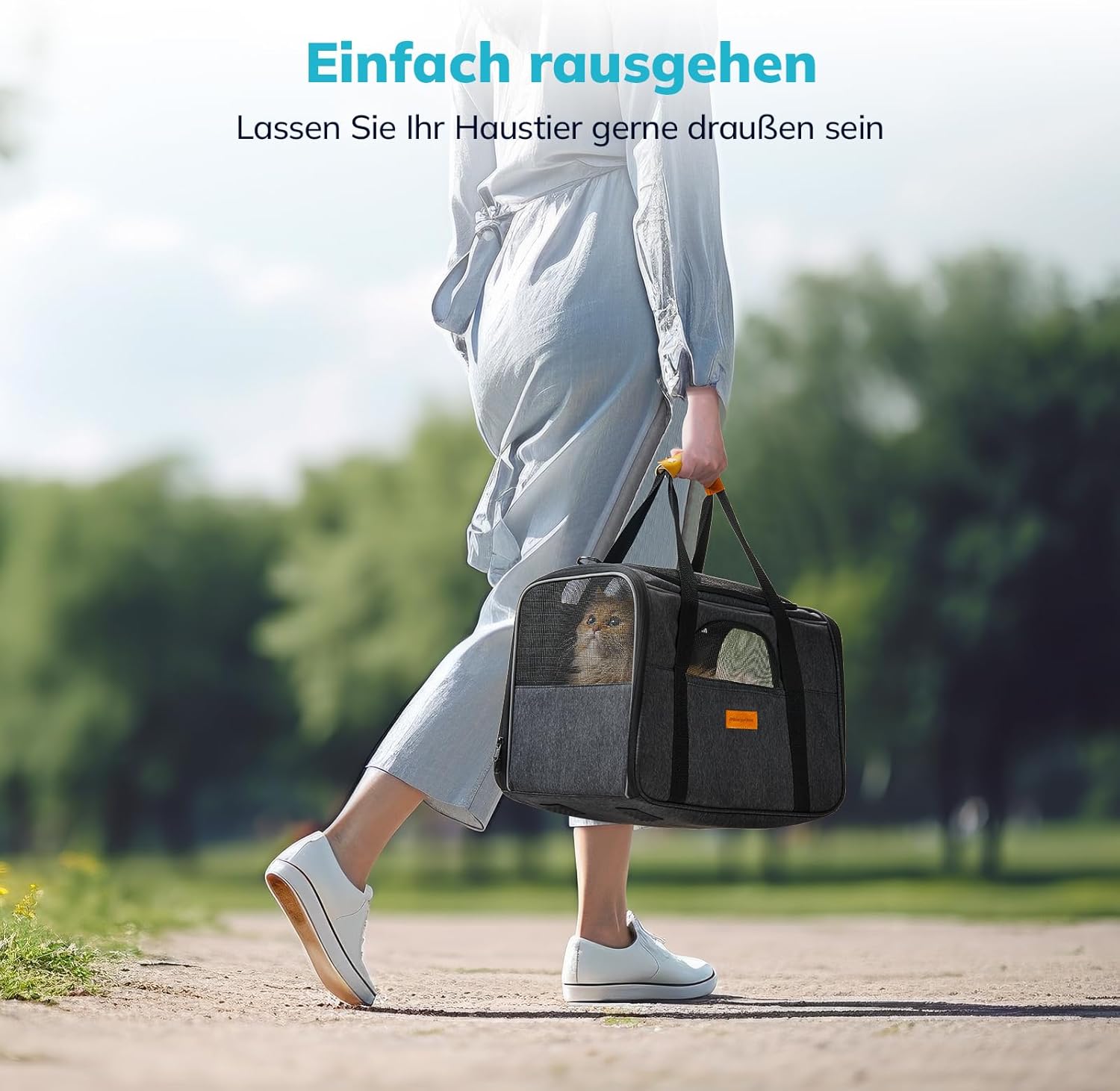 • УНИВЕРСАЛЕН СПРАВТОР ЗА ПЪТУВАНЕ Голямата преносима кутия за котки осигурява на вашия домашен любимец достатъчно пространство за движение, въртене и разтягане, когато пътувате на дълги разстояния. С размери 43 x 28 x 35 см, тя е по-широка и по-висока от повечето преносими кутии за котки и гарантира, че вашият домашен любимец се чувства комфортно и спокойно в движение. Преносимата кутия за котки е подходяща за всички видове котки и малки животни и е перфектният спътник за пътуване с кола, влак и самолет.