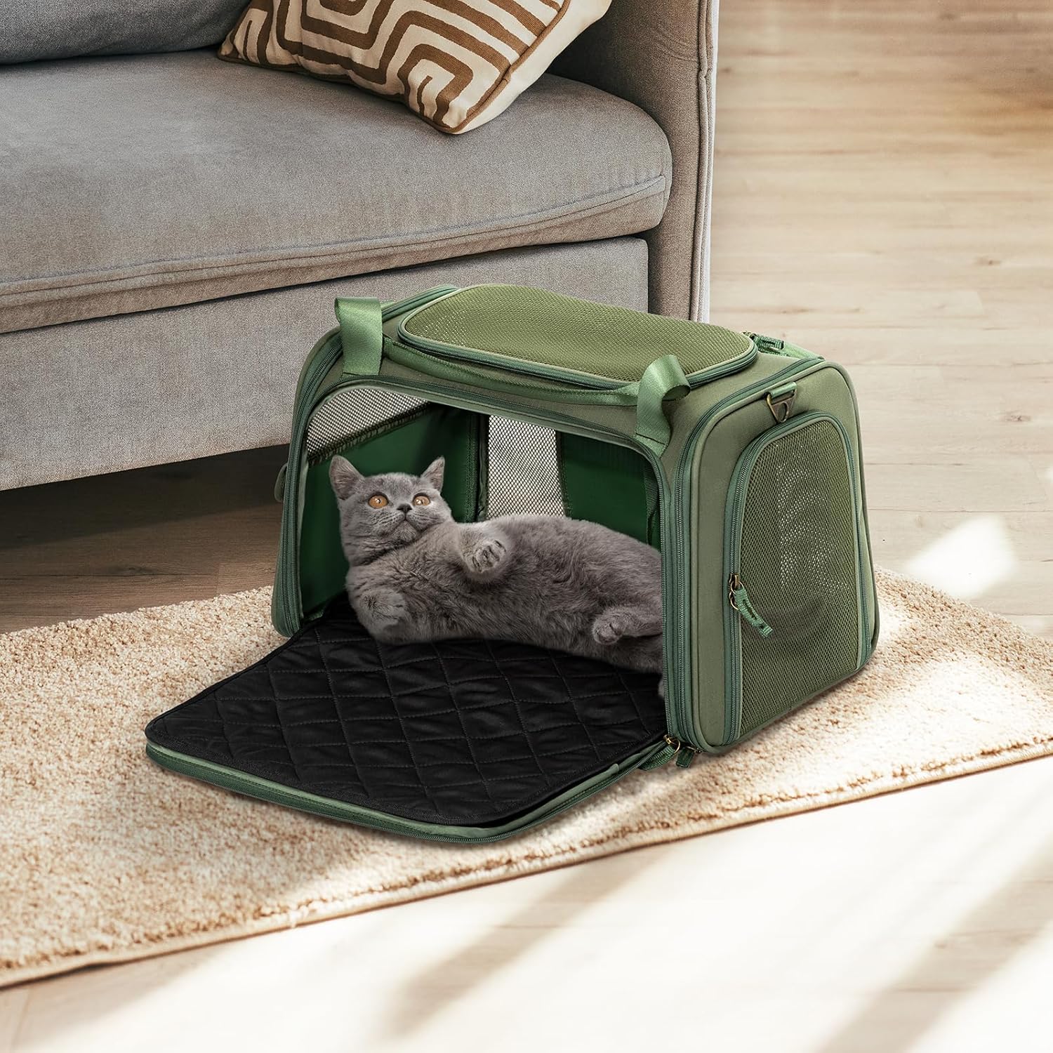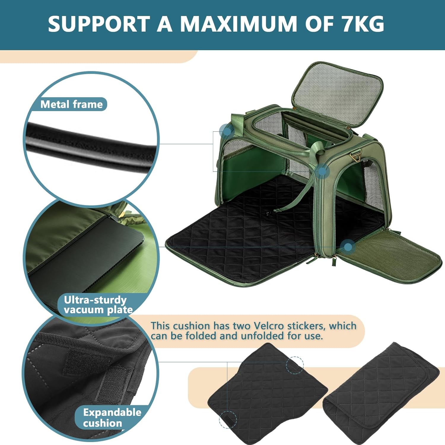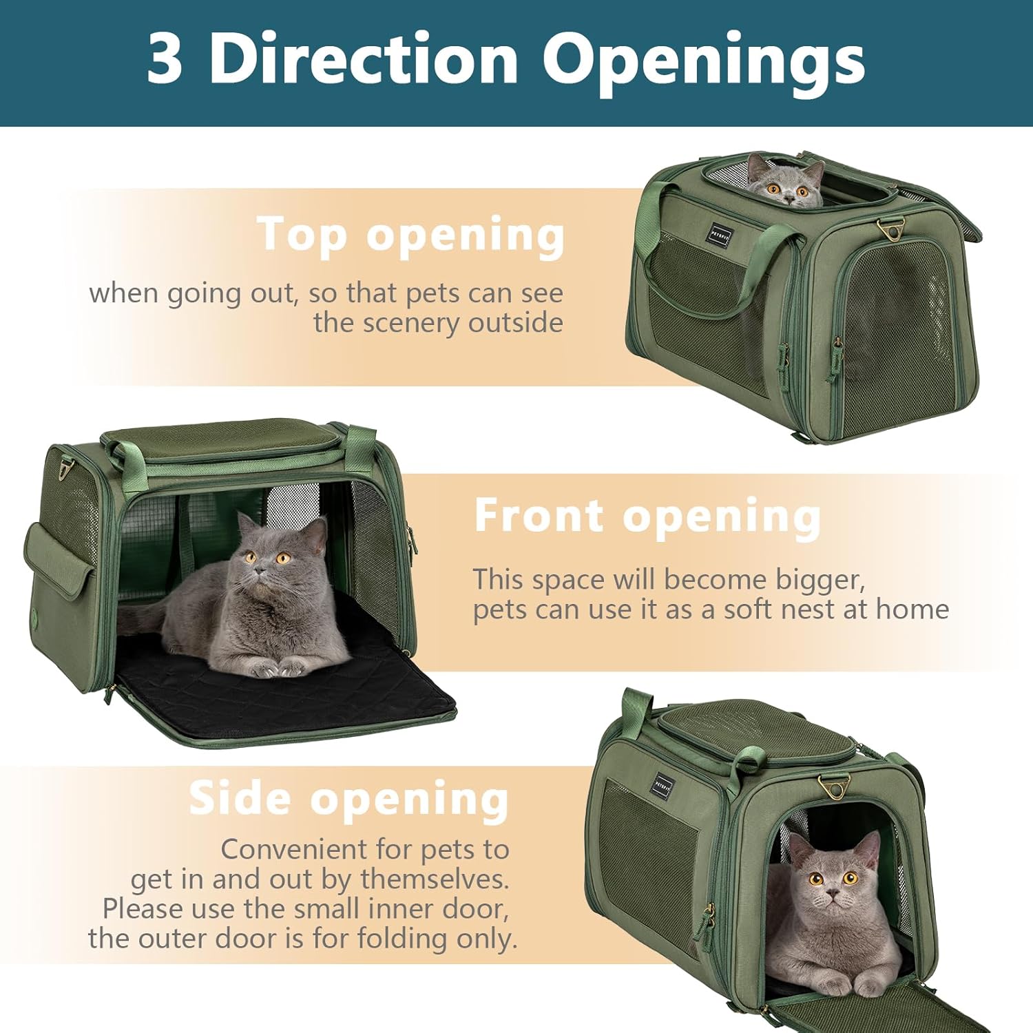 • УДОБНА, ПРОСТОРНА И ДИШАЩА: Четиристранният мрежест прозорец на транспортната кутия за котки е изработен от специална 3D сандвич мрежа, която увеличава уединението и безопасността на домашните любимци, като същевременно осигурява добра въздухопропускливост, особено подходяща за срамежливи домашни любимци; меката възглавница може да се разгъне за употреба.