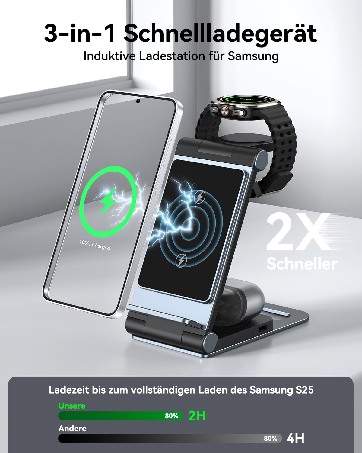 • Индуктивна зарядна станция за Samsung Сгъваемата 3 в 1 зарядна станция е съвместима със сериите Galaxy S25, S24, S23, S22, S21, S20, S10, S9, S8, Note, както и със сериите Z Flip и Z Fold (7/6/5/4/3), Galaxy Watch (8/Ultra/7/6/Classic/5/5/3), Pro/4/3) и Galaxy Buds. Внимание: За да осигурите правилно зареждане, моля, използвайте оригиналния адаптер или адаптер за зареждане с мощност поне 18 W.