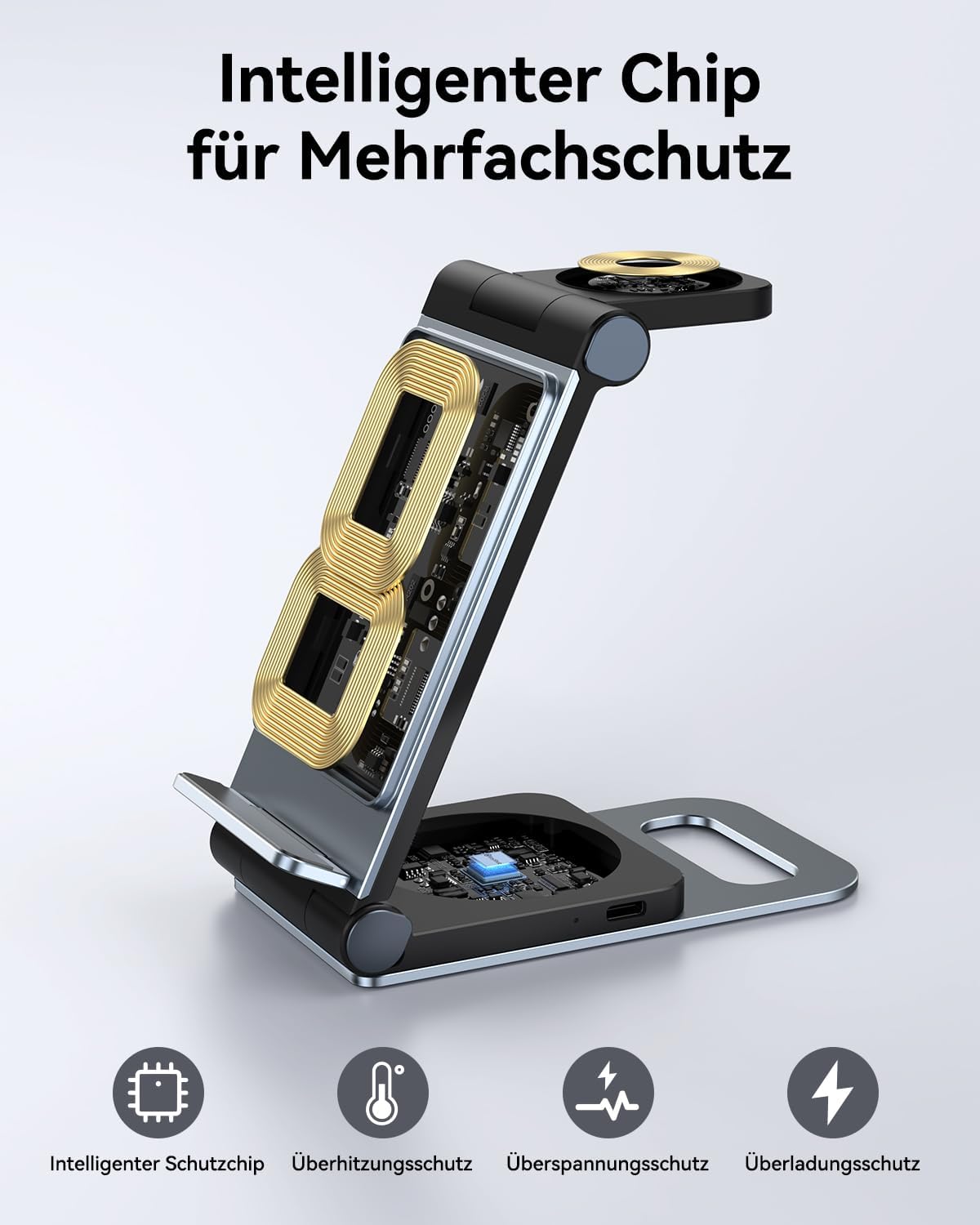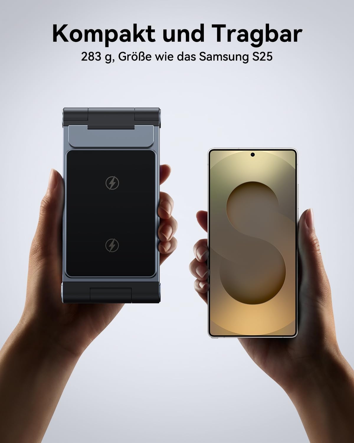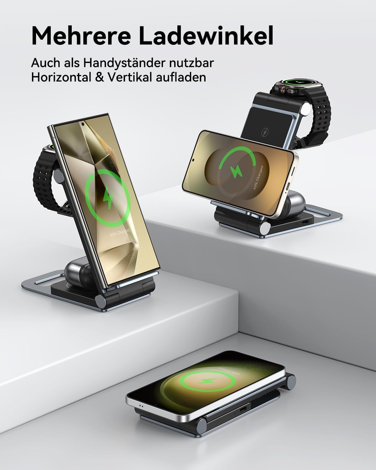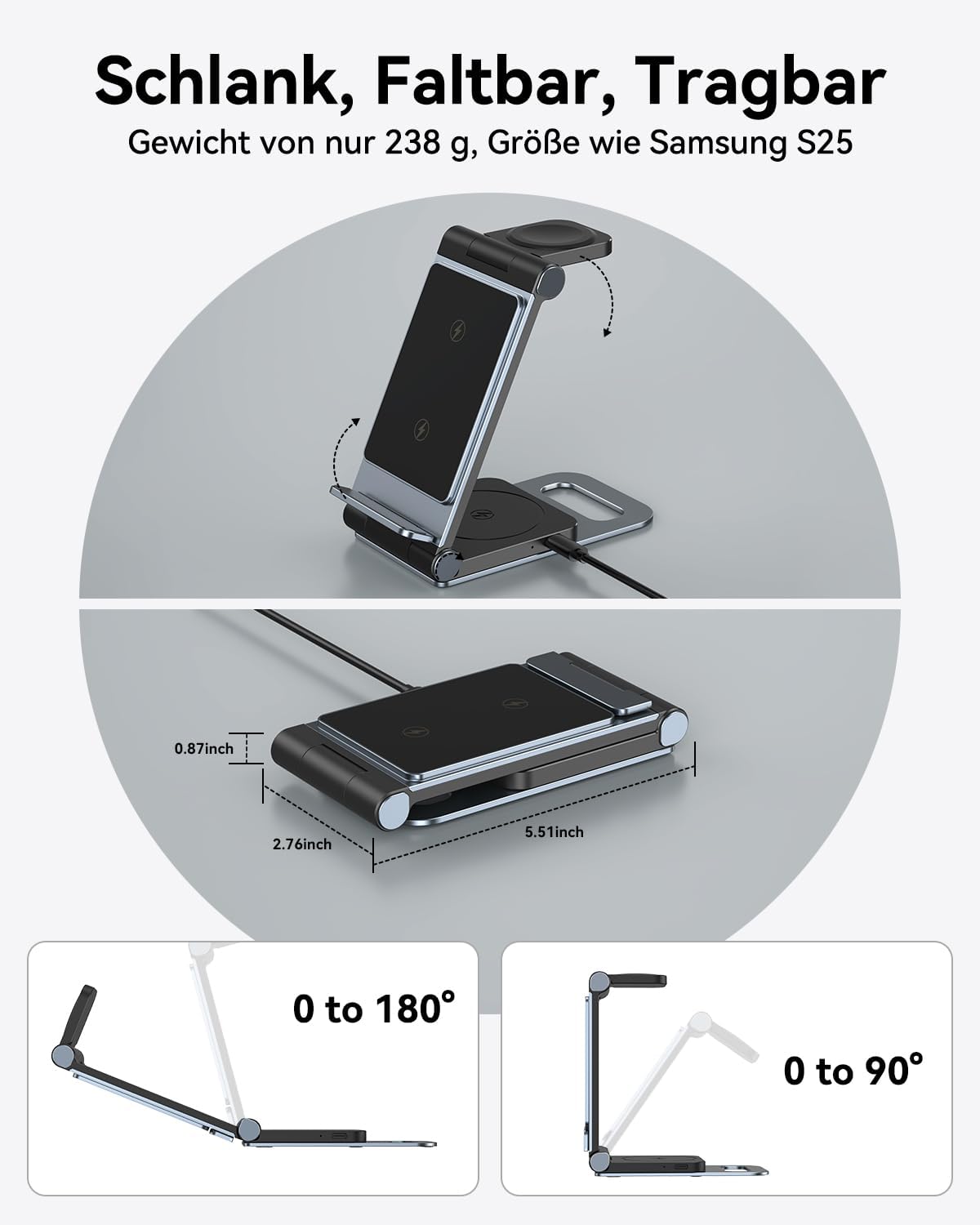 • ПРЕНОСИМА СГЪВАЕМА ЗАРЯДНА СТАНЦИЯ Това безжично зарядно устройство за Samsung се сгъва внимателно на 180° и се превръща в удобна подложка за зареждане. То е компактно, леко и се побира лесно в чанти или куфари. Идеално за дома, офиса или пътуване. С това 3-в-1 зарядно устройство можете да зареждате няколко устройства едновременно - и също така да го използвате като регулируем държач за телефон.