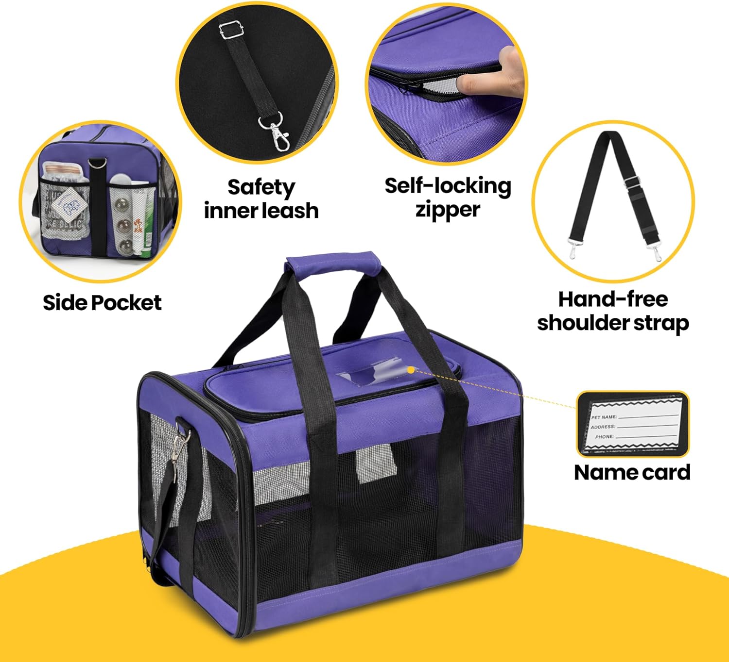 • Дишаща и практична: кошницата за котки с отварящ се плот и три мрежести прозореца осигурява свеж въздух и гледка, намалява страха на домашния любимец и му осигурява комфорт. Външните джобове могат да поберат храна, каишки, чанти и други важни вещи за домашния любимец.