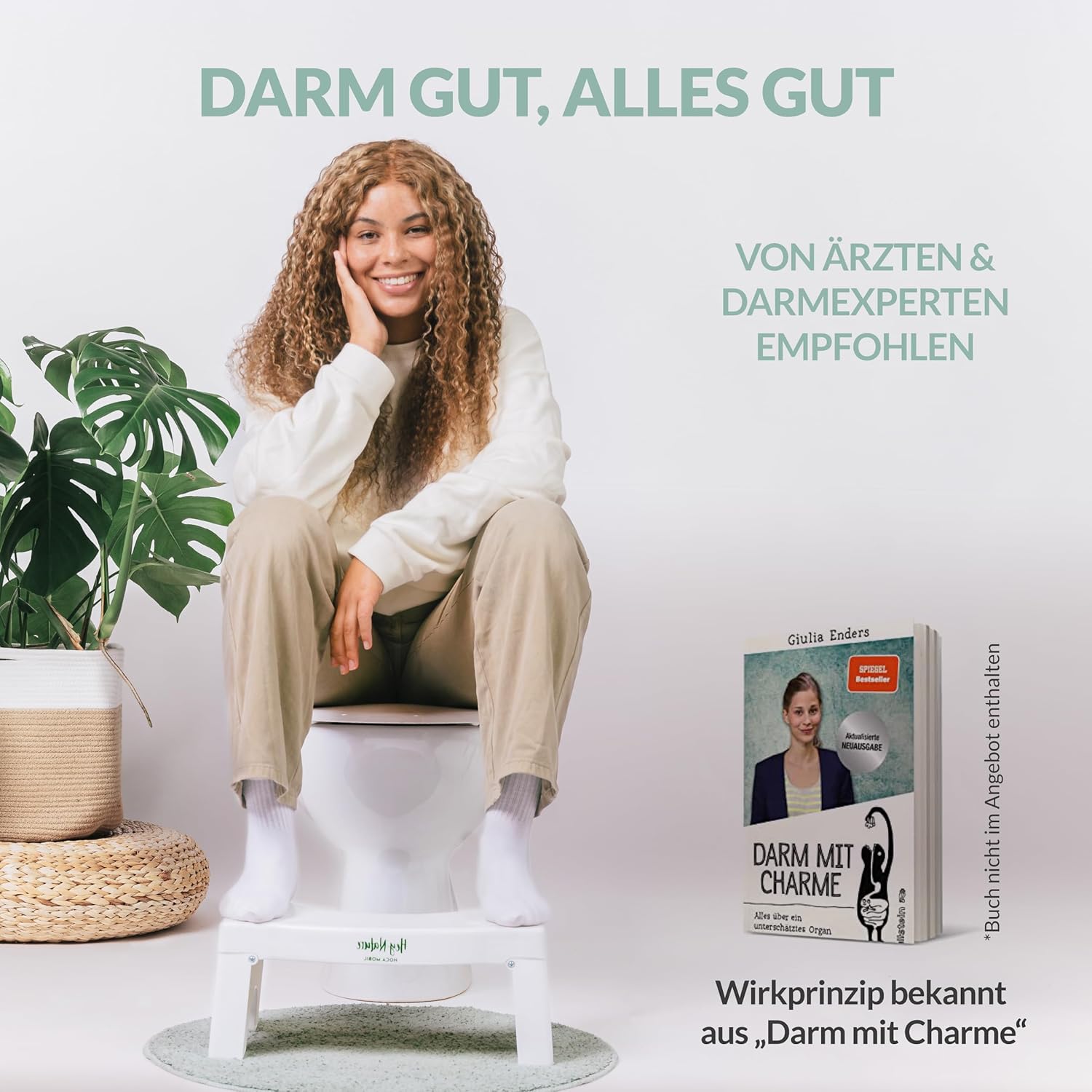 Седнете на тоалетната чиния. Издърпайте столчето и поставете краката си върху него. Изпразнете червата си в естествено клекнало положение. Моля, не използвайте столчето като стъпало, а само когато седите.
