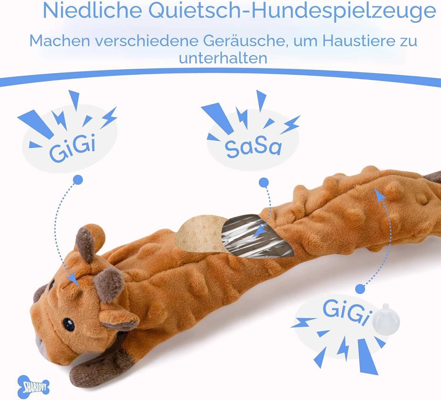 • ДЪЛГА ПЛЮШЕНА ИГРАЧКА ЗА КУЧЕ С ПИЩУШКА: Всяка играчка е супер дълга, изработена от висококачествен плюш, невероятно мека и щадяща кожата. С две вътрешни пищялки, защитени с плат, за да се предотврати изскубването им от кучето. Осигурява часове забавление за вашето куче. Интерактивна играчка за кучета против скука.