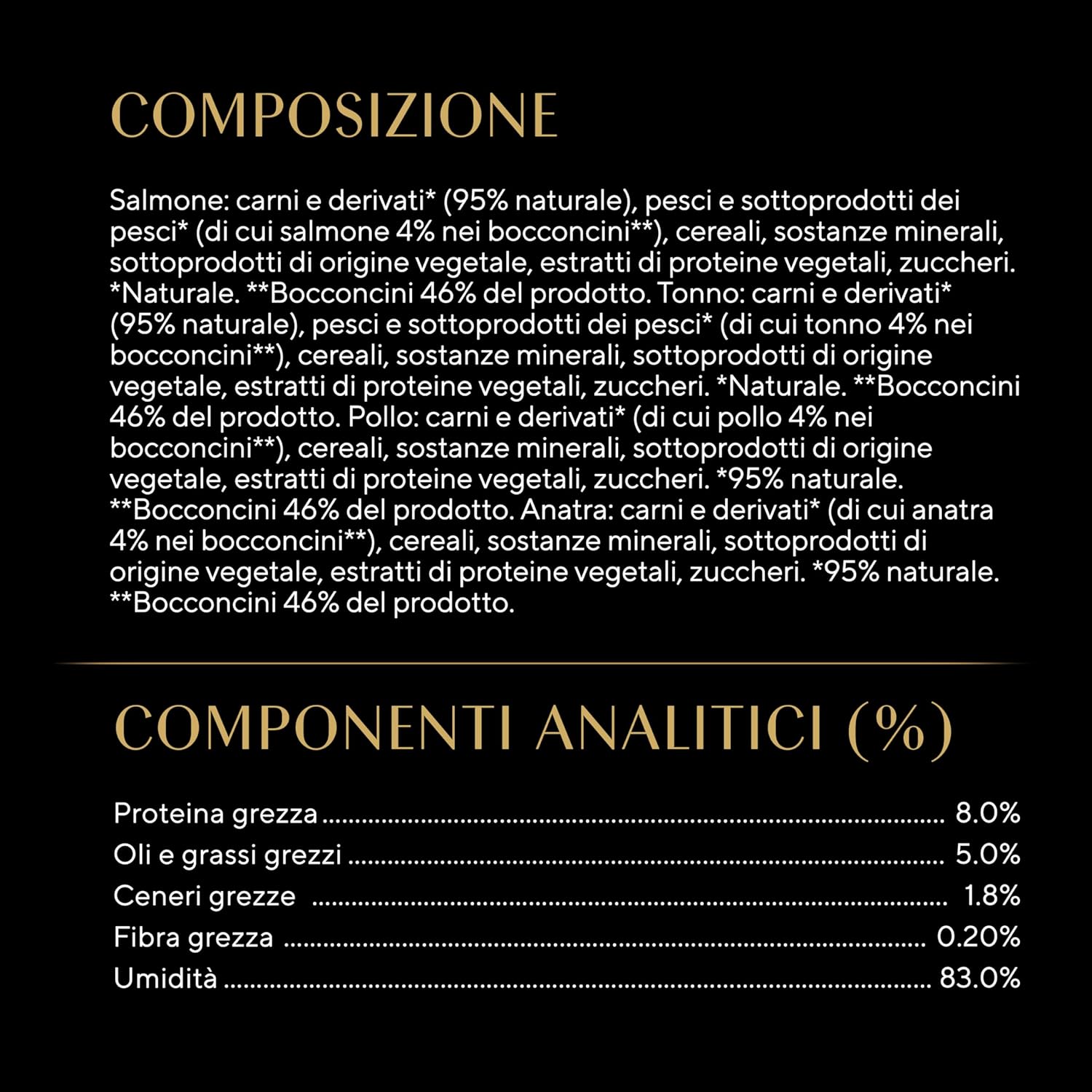 С патешко месо - Състав: Месо и животински продукти* (включително патешко месо 4% в хапките**), растителни продукти, зърнени храни, минерали, захари. *93% натурален. **Хапките съставляват 43% от продукта. С пилешко месо - Състав: Месо и животински продукти* (включително пилешко месо 4% в хапките**), растителни продукти, зърнени храни, минерали, захари. *93% натурален. **Хапките съставляват 43% от продукта. С птиче месо - Състав: Месо и животински продукти* (включително птиче месо 4% в хапките**), растителни продукти, зърнени храни, минерали, захари. *93% натурален. **Хапките съставляват 43% от продукта. С патешко и пуешко месо - Състав: Месо и животински продукти* (включително патешко месо 4% и пуешко месо 4% в хапките**), растителни продукти, зърнени храни, минерали, захари. *93% натурален. **Закуските съставляват 43% от продукта.