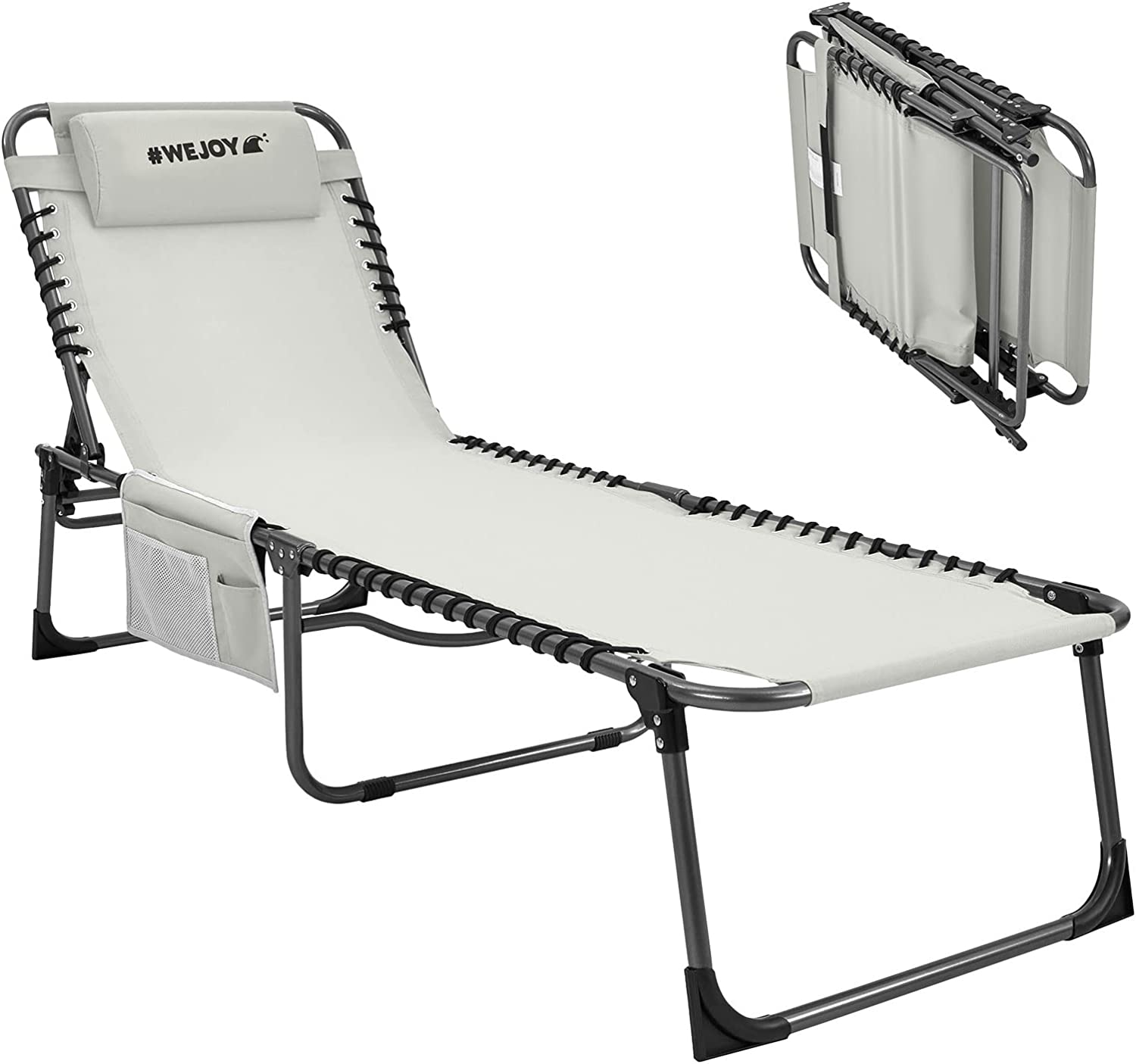 Шезлонг WEJOY, 37 x 190 x 59 см, Издържа до 120кг, Сгъваем, Регулируем наклон, Страничен джоб, Сив