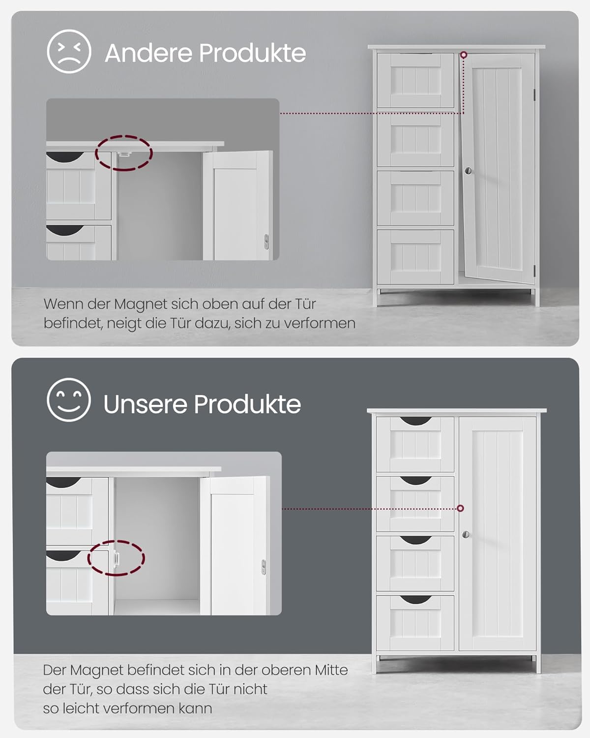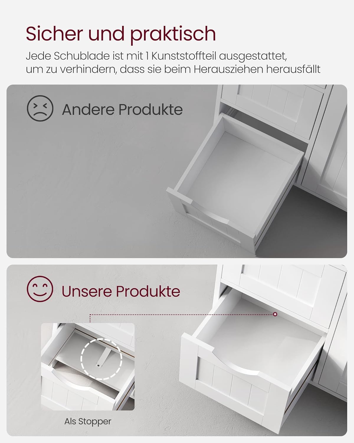 • Стабилен и безопасен: Благодарение на здравите MDF панели, този шкаф за баня е здрав и стабилен; включената защита от накланяне осигурява допълнителна стабилност и безопасност.