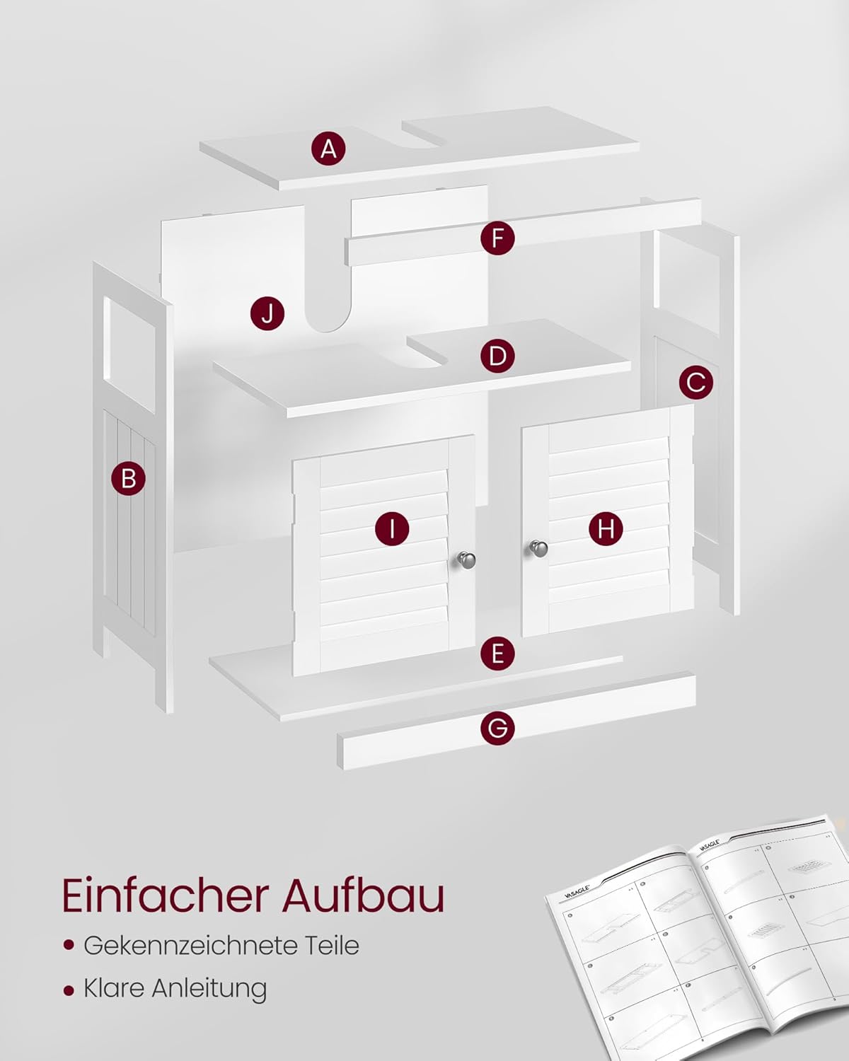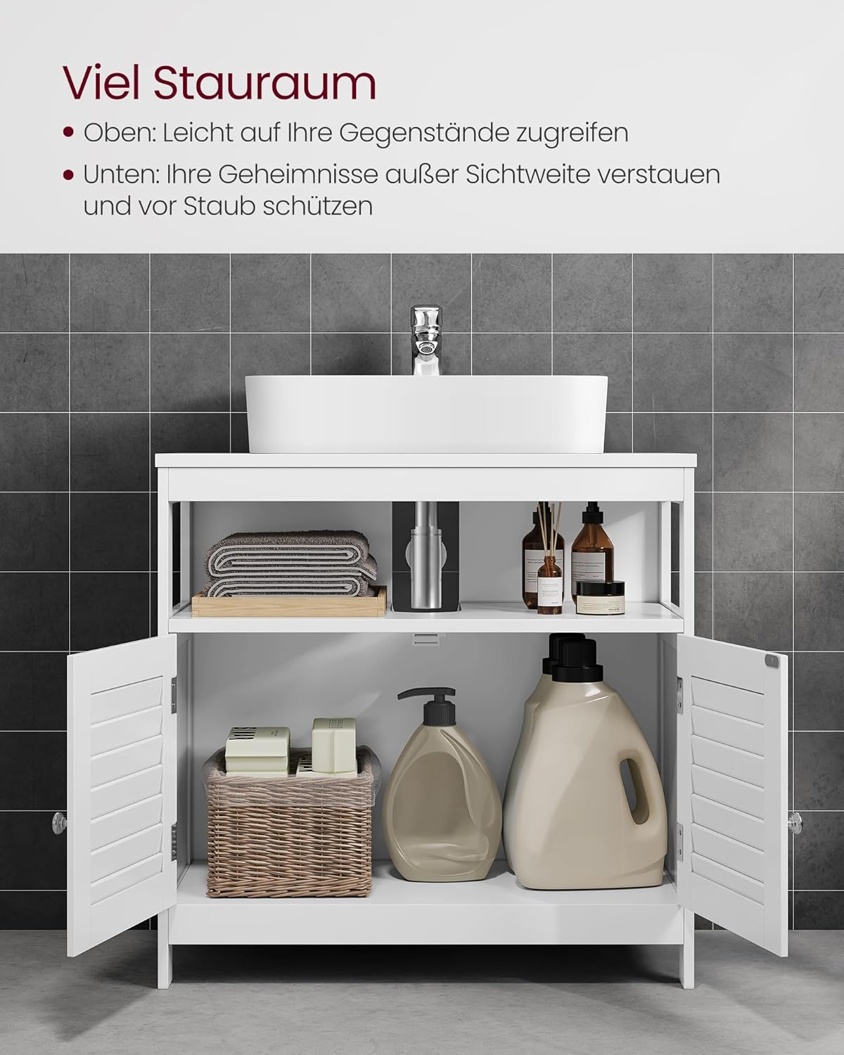 Шкаф за мивка Vasagle, шкаф за баня, долен шкаф без мивка, място за съхранение, голямо пространство за съхранение, шкаф за баня с врати с ламели, 2 отделения, бял 60 x 60 x 30 см (Ш x В x Д), BBC02WT