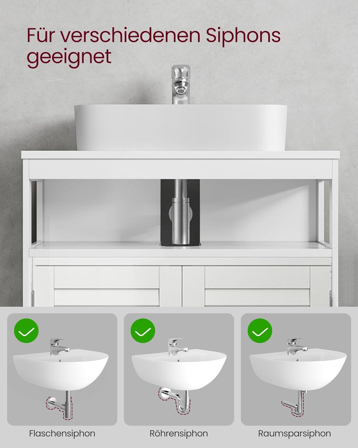• Размери – размери на сифонния изрез: 20 x 8 см, размери на долния шкаф: 60 x 60 x 30 см (Ш x В x Д), преди покупка, моля, измерете размера на сифона на вашата мивка и наличното пространство под мивката и определете дали този шкаф ще се побере.