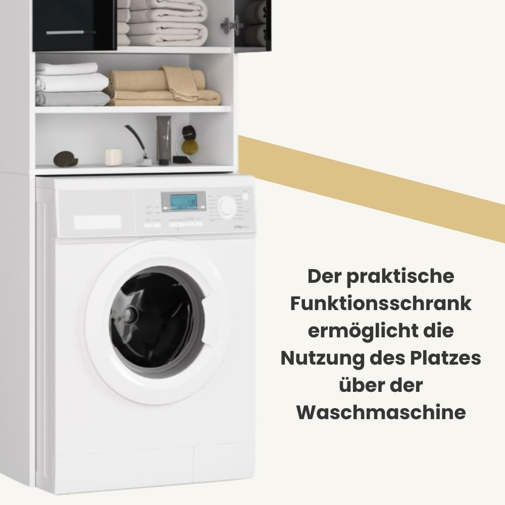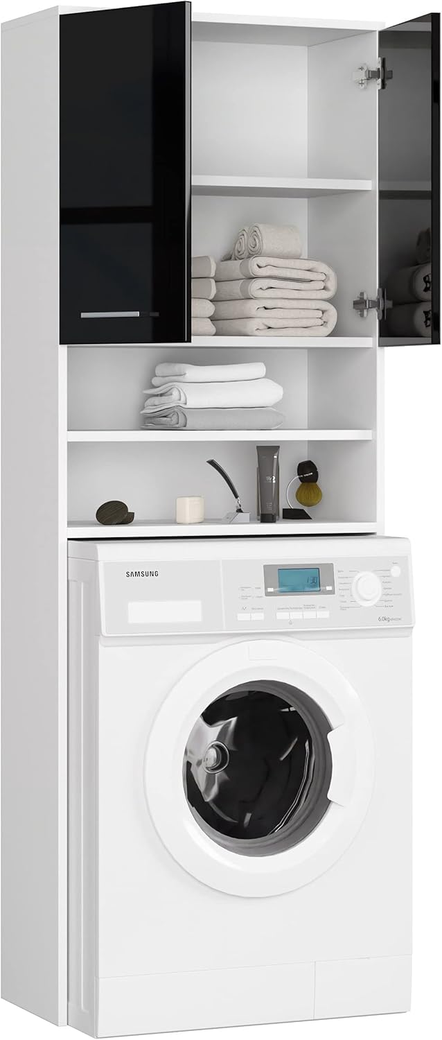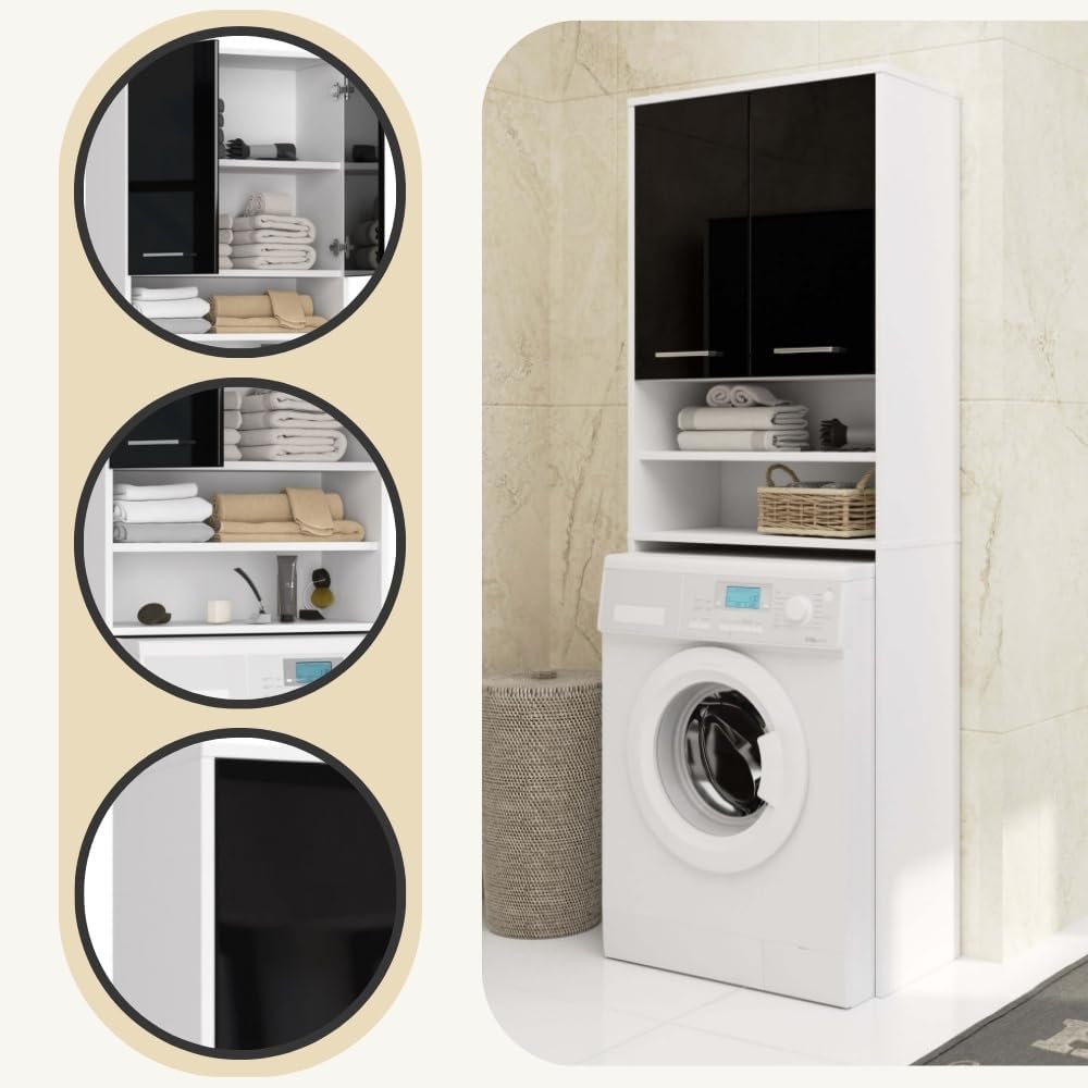 Шкаф за пералня AKORD, Шкаф за баня, Скрин, Шкаф за пералня, Ш 64 x В 180 x Д 30 см, Тегло 30 кг, Шкаф за преобразуване с 2 врати, 2 рафта, Бял и черен гланц
