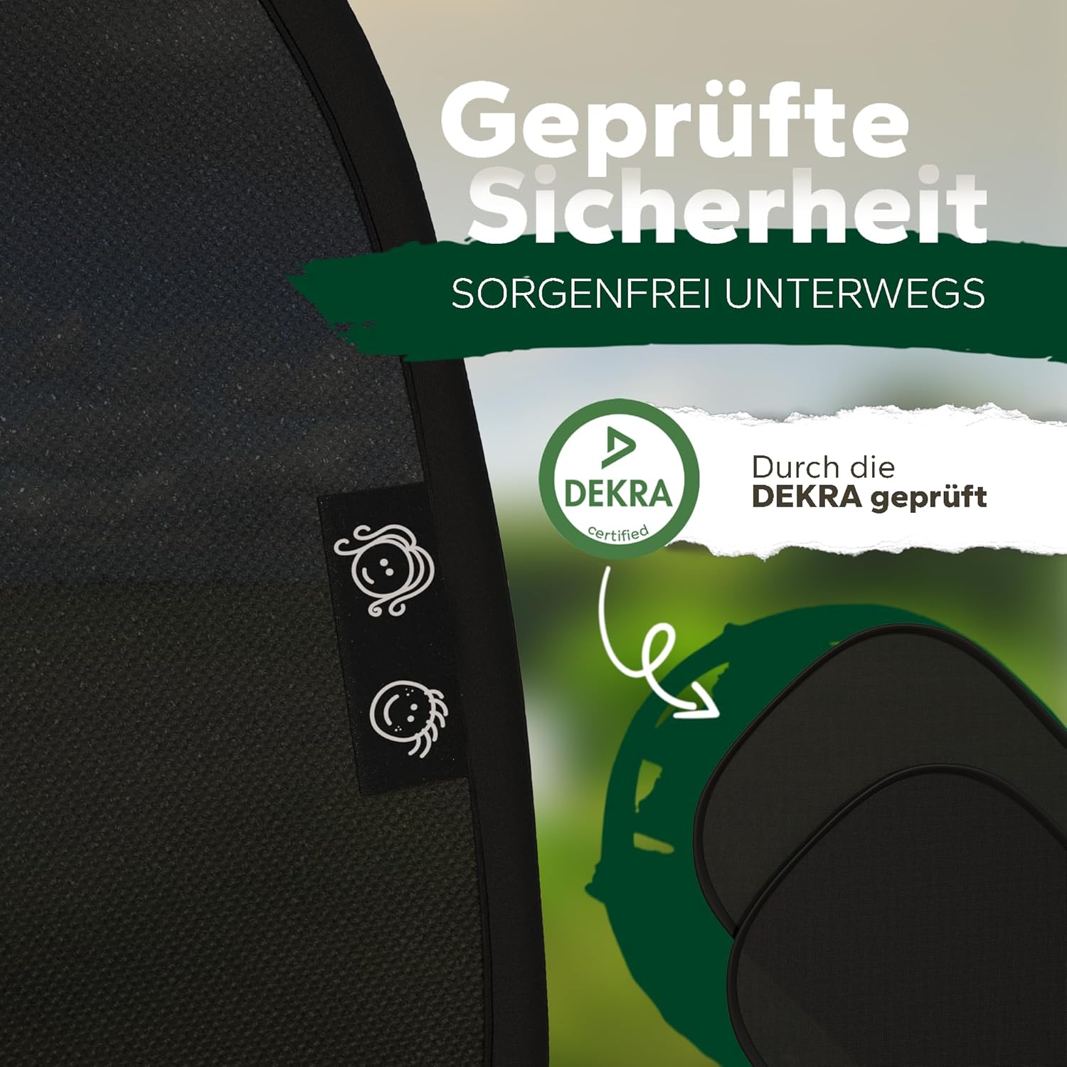 Щори за автомобилни прозорци за бебета • СЕРТИФИЦИРАНА UPF50+ UV защита • Сертифициран от DEKRA • Издръжлив найлон GSM105+ • Двойна защита • Сенник за кола за бебета • Универсален размер